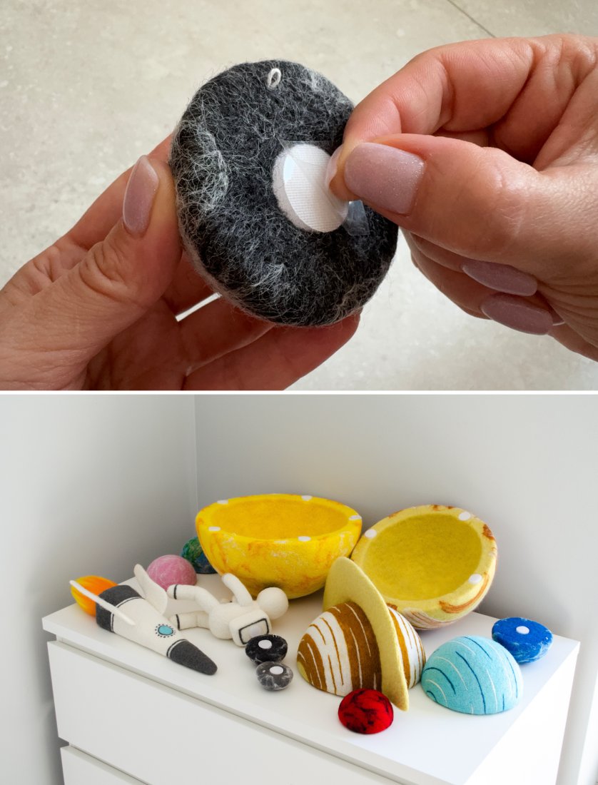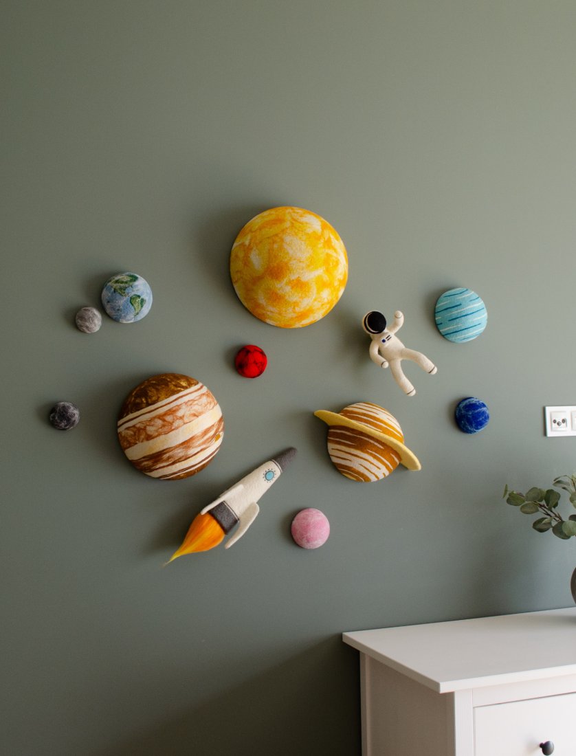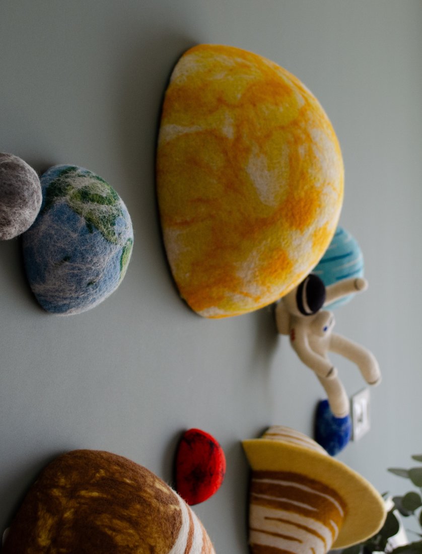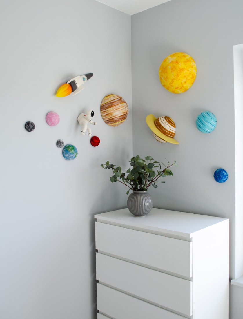 Stwórz w pokoju dziecka magiczny wszechświat! Ten ręcznie wykonany zestaw filcowych planet 3D to lekka i bezpieczna dekoracja ścienna lub sufitowa. Każdy element można łatwo zawiesić za pomocą haczyków i rzepów (w zestawie).
