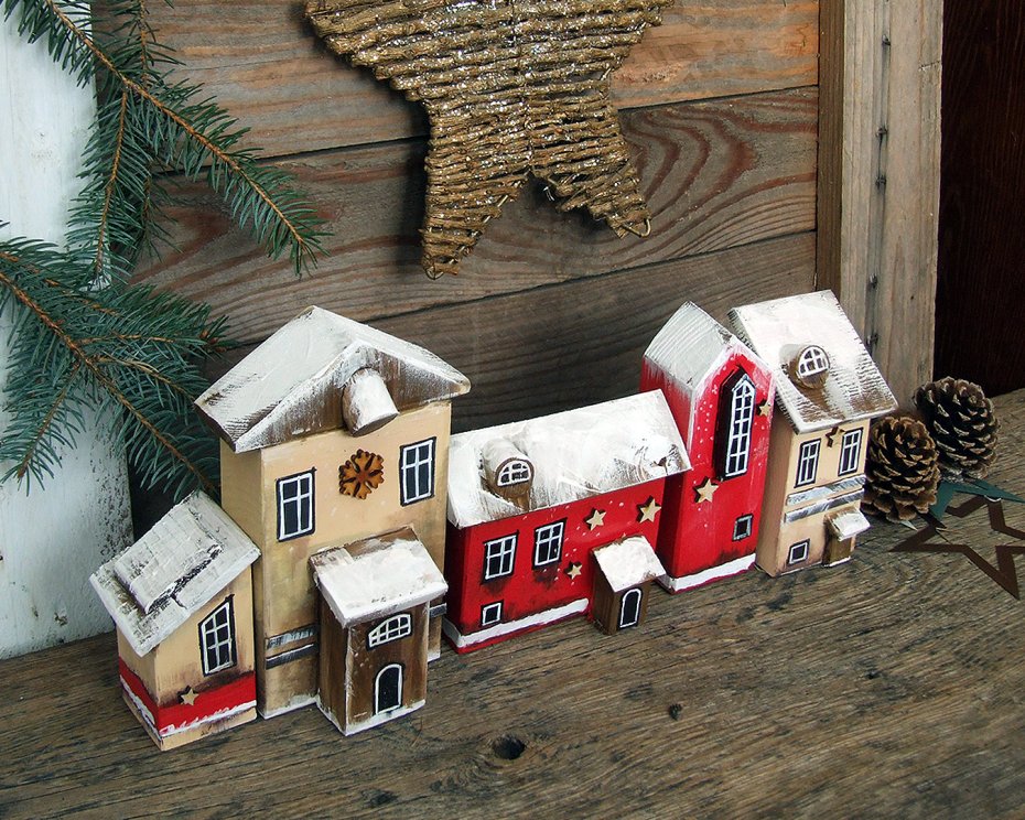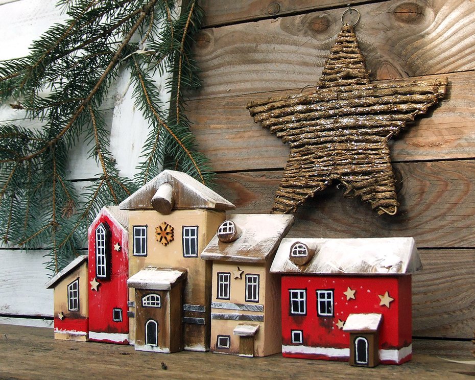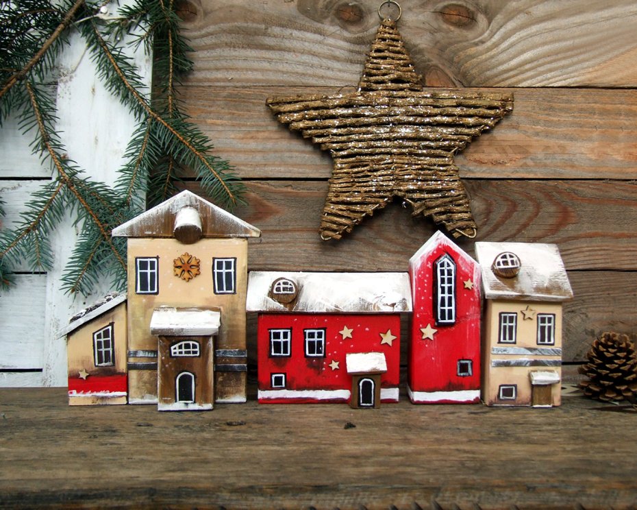 Pięć drewnianych domków, ręcznie malowanych - dekoracja w zimowym świątecznym klimacie, do aranżacji wnętrza, także jako dodatek do stroików. Domki będą także pięknym prezentem, dla bliskich kochających rękodzieło, drewno i naturalne dodatki do domu.