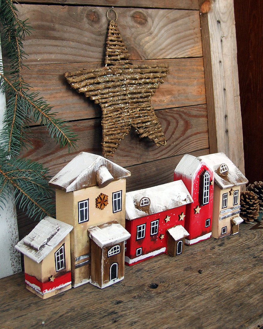 Domki ustawiamy obok siebie lub osobno, jako pojedyncze dekoracje. Wykonane są z drewna sosnowego, malowane farbami akrylowymi i lakierem akrylowym, matowym. Dodatkowe elementy to dooklejone, małe gwiazdki.