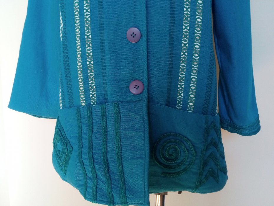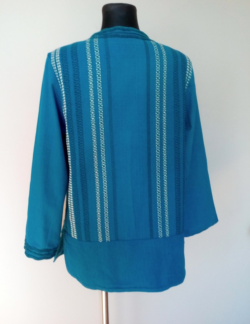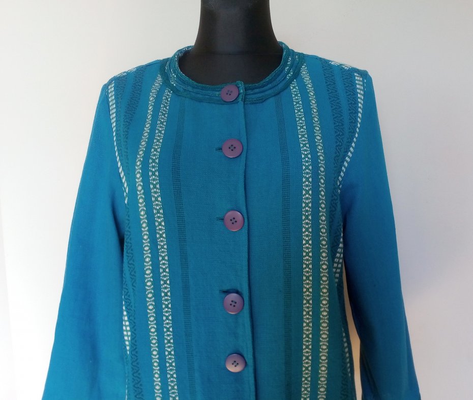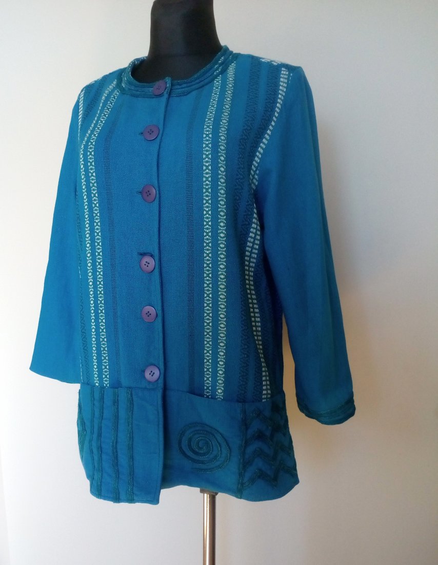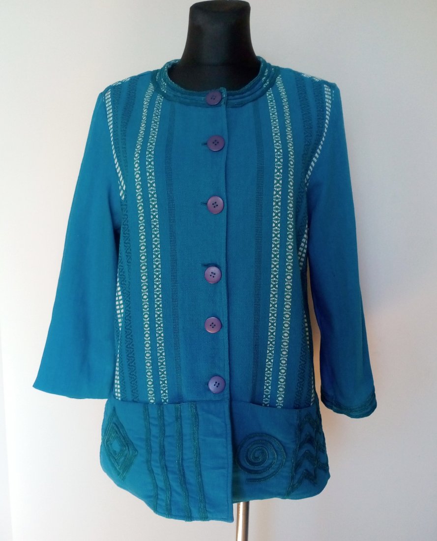 ładny żakiet z tęższej bawełny, kolor niebieski ze śladową ilością zieleni, bieli i granatu, u dołu przodu poziomo wpuszczane kieszenie, boki rozcinane, całość bez podszewki