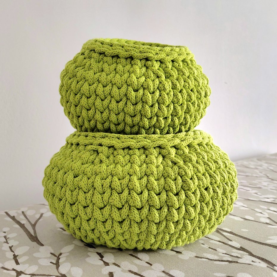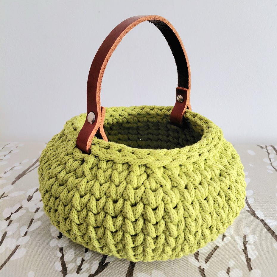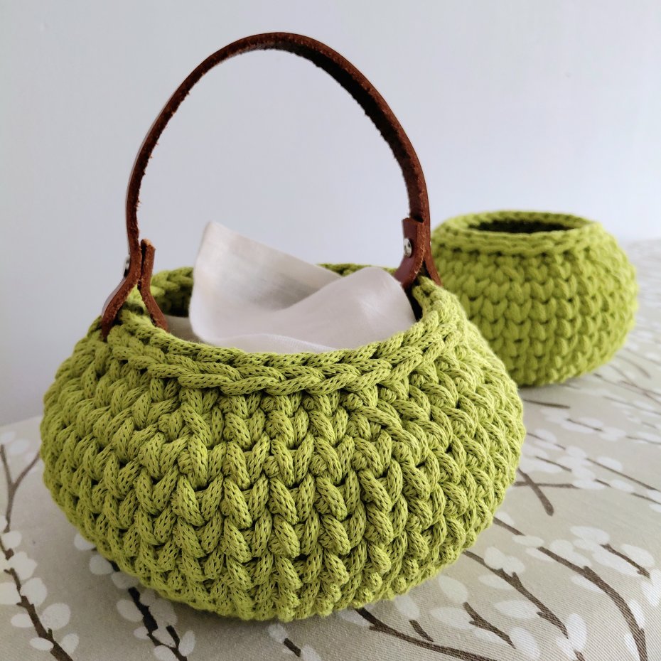 Dwa pękate, sztywne koszyczki, wykonane w całości z certyfikowanego sznurka bawełnianego grubości 0,5cm w limonkowym kolorze, posiadające skórzane uchwyty, które z łatwością można odkręcić.