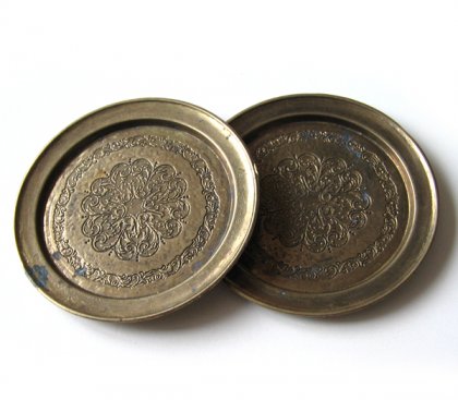 Dwa śliczne podstawki wykonane z mosiądzu. Delikatnie zdobione na spodzie, idealne jako podstawka pod kwiat, świeczke lub pojemniczki na drobiazgi. Polecam!