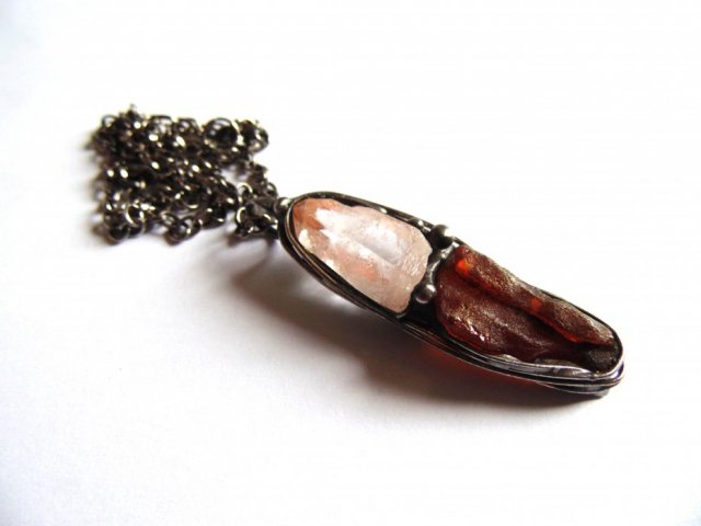 Wisiorek wykonany z miedzi, cyny, surowego bursztynu i kryształu górskiego. Wymiary ok. 5,5 na 1,8 cm. Łańcuszek o długości ok. 45 cm.