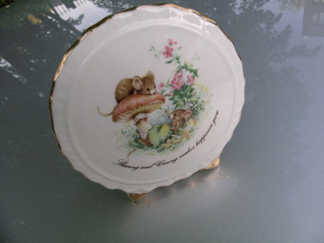 Wazonik - Obrazek ze szlachetnie cienkiej i dzwięczącej porcelany w kolorze ciepłej bieli i absolutnie uroczym obrazkiem - Shaung and Caung makes happines grow. Delikatne barwy,błyszczące wykończenie i bogato złocony rant. Niby medalion nieco wypukły z ryflowaniami dookoła i na rancie; Ciekawa to forma - jak bez kwiatków to obrazek :)