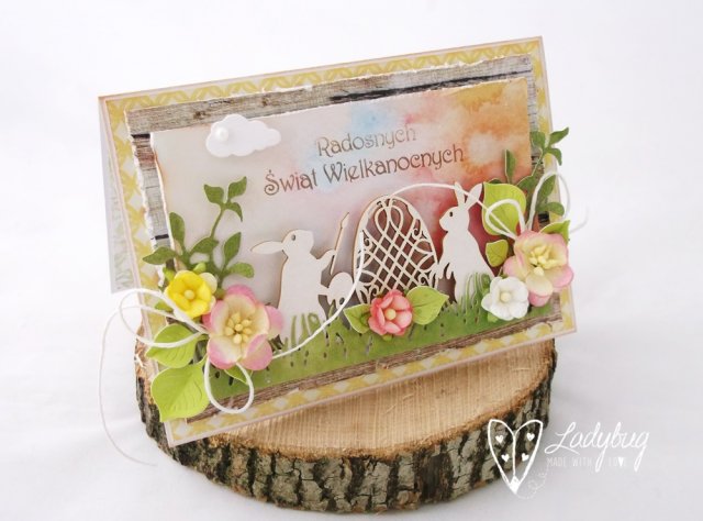 Kolorowa i radosna kartka wielkanocna z dwoma zającami malującymi pisankę. Ciepła i wiosenna kolorystyka, kwiaty i trawy.