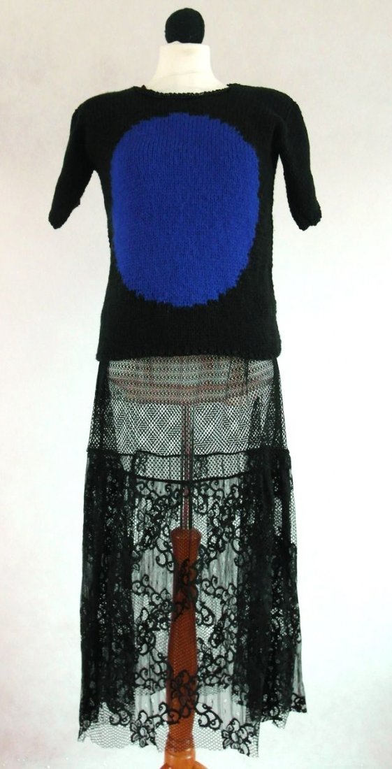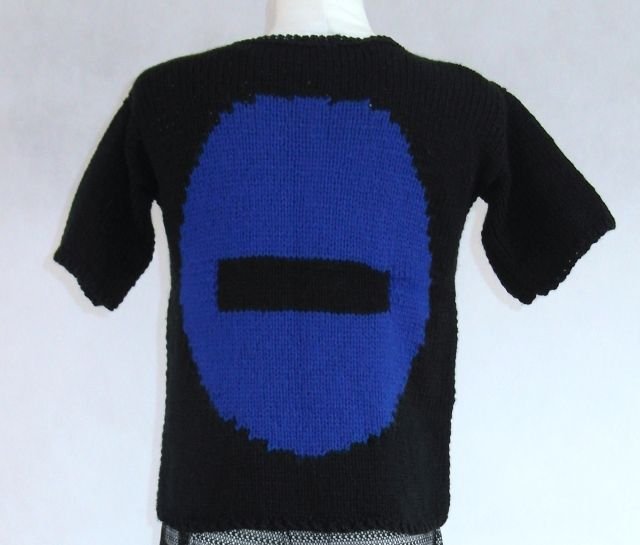 Czarny - przód szafirowe koło, tył szafirowy "zakaz wjazdu" ;-).Ozdobne wykończenie szyi. Raczej dopasowany.