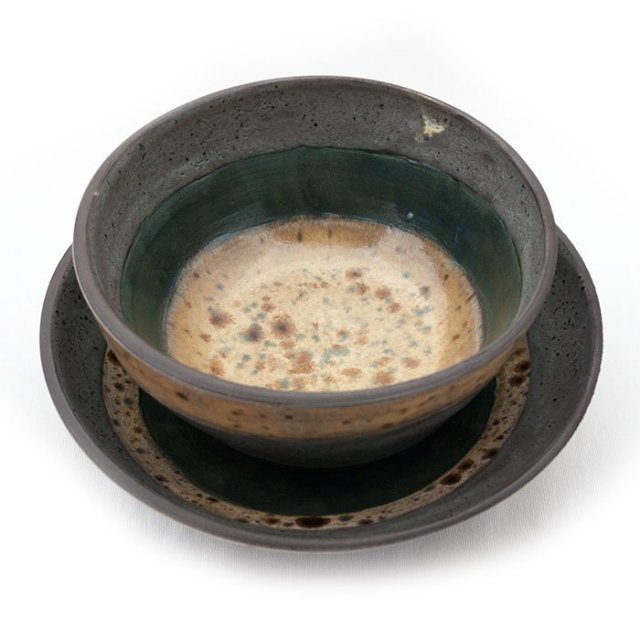 Dwie miski toczone na kole, z surowym brzegiem z ciemno-brązowej gliny.