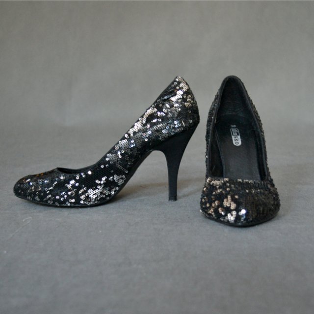 Świetne szpileczki o klasycznym fasonie. W błyszczące cekiny w kolorze czarnym i w mniejszej ilości w srebrnym. Bardzo efektownie wyglądają na nodze.
