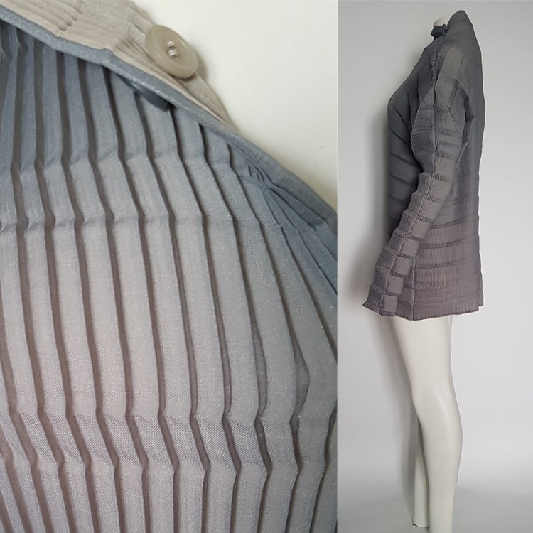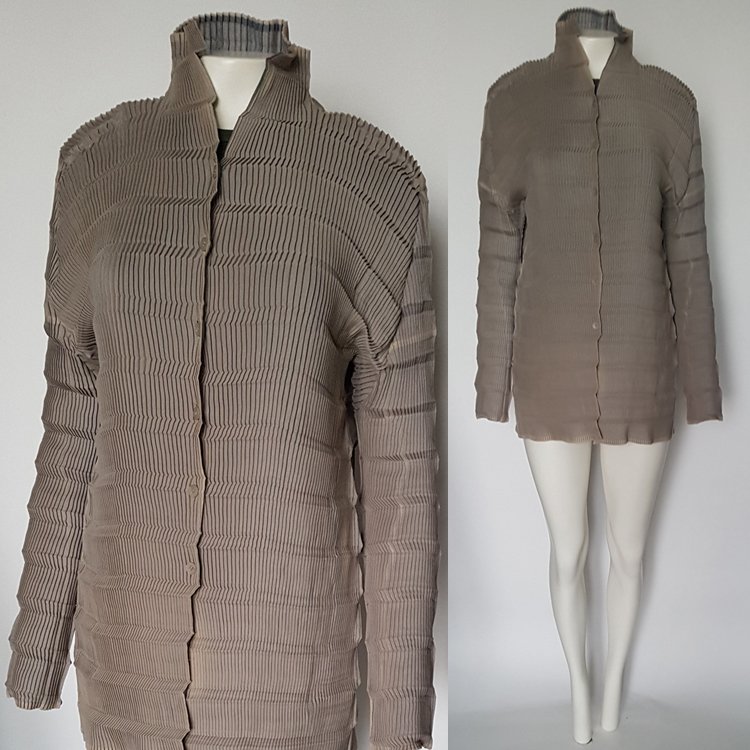 Wyjątkowa dwustronna koszula / narzutka/ wdzianko w przestrzenny geometryczny wzór. Brak metek, wydaje się, może być modelem z kolekcji pleats Issey Miyake. Charakterystyczny motyw i jakość wykończenia wskazywałyby na to. Koszula jest dwustronna z jednej beżowa z drugiej szara, można nosić na jednej i na drugiej stronie. Układ zakładek dopasowuje się do obwodu. Nie wymaga prasowania. Z pewnością jest to propozycja wyjątkowa, dla nieszablonowej osoby, która będzie mogła ją nosić na wiele sposobów, jako koszulę, jak sweter, czy kurtkę.