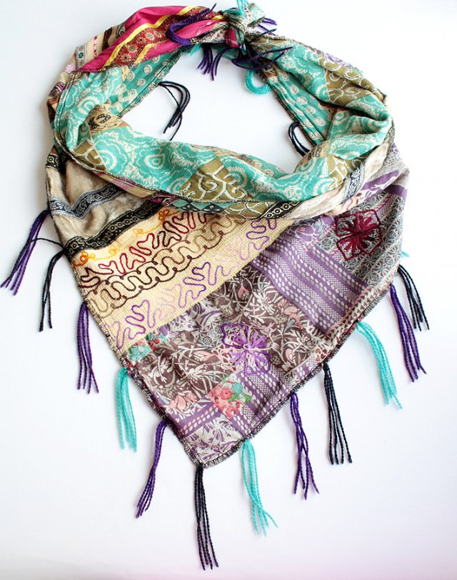 Dwustronna, trójkątna chusta uszyta z kilkudziesięciu różnnych elementów. W mojej ocenie są to tkaniny naturalne.