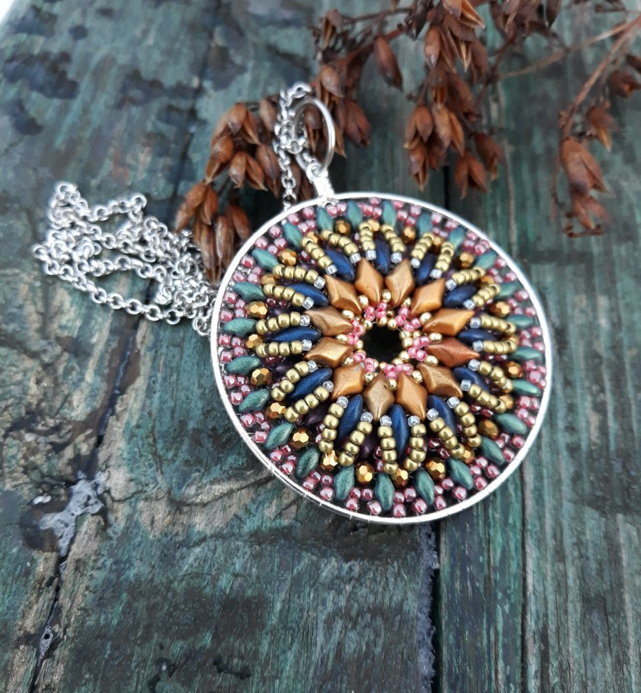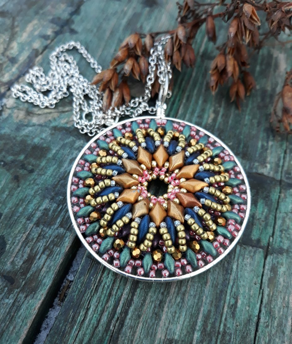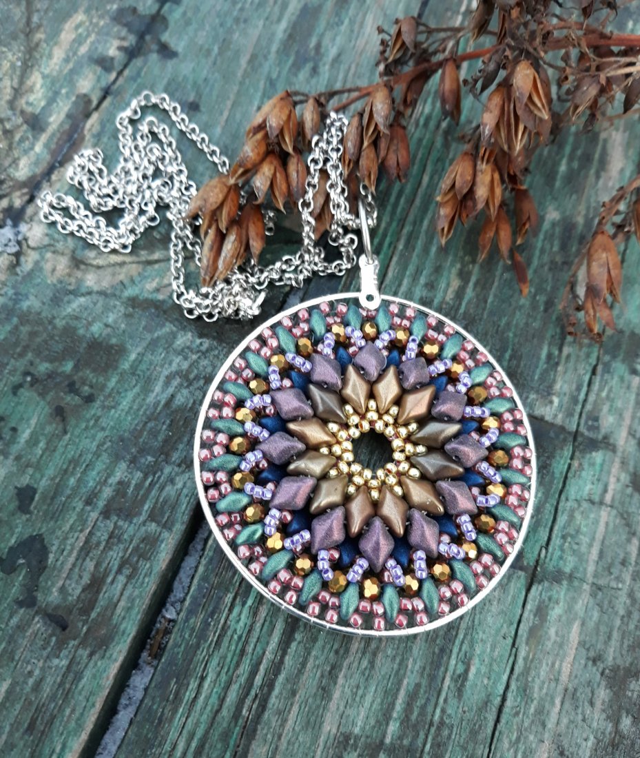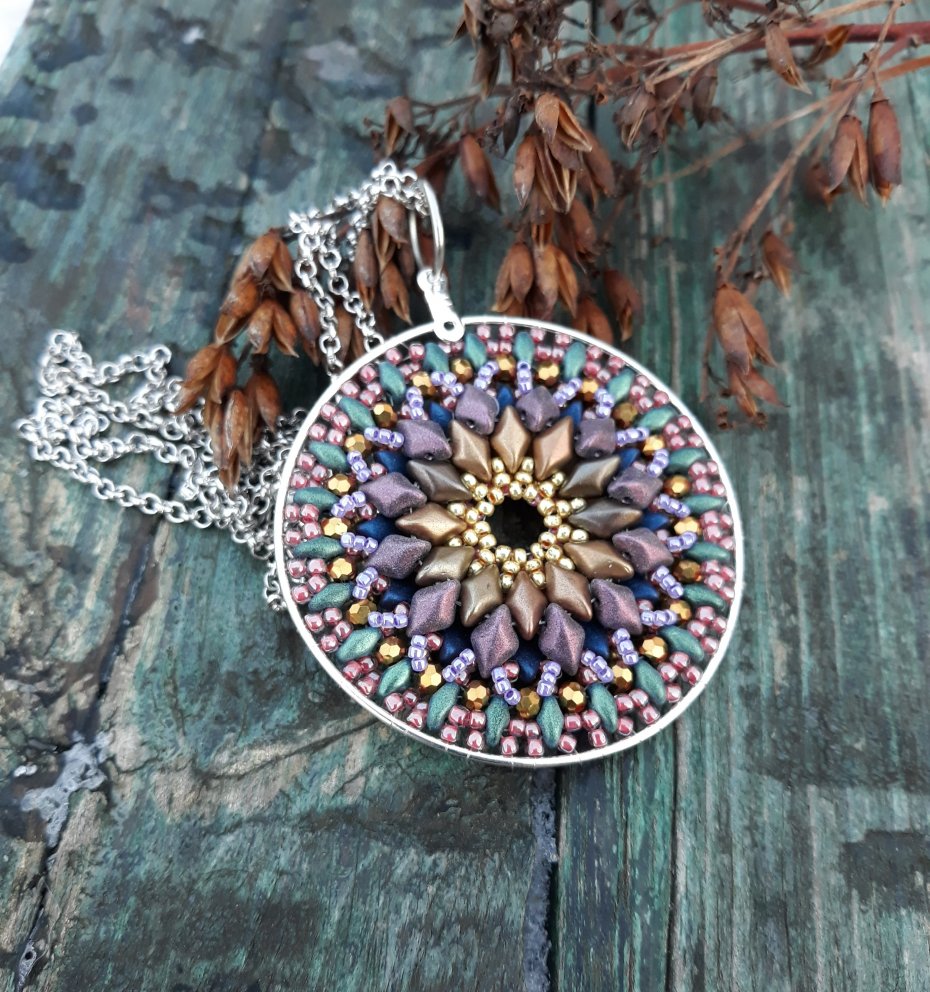 ,,dwustronna mandala,, to dwustronny wisior wykonany na obręczy ze szklanych koralików i kryształków. Jedna strona utrzymana jest w kolorystyce fioletu z dodatkiem złota i zieleni, a druga wykonana jest ze złotych, zielonych i niebieskich koralików.