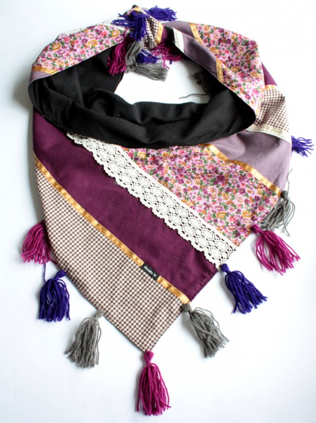 Wspaniała dwustronna chusta marki Renee K. Z jednej strony ozdobiona patchworkiem, z drugiej-czarna.