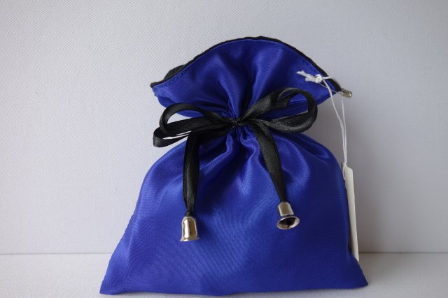 Zawiązywana dwiema satynowymi, czarnymi tasiemkami zakończonymi metalowymi dzwonkami w kolorze srebrnym, wpuszczonymi w tulejkę 4,5 cm od górnej krawędzi. W zależności od wariantu możesz mieć sakiewkę w kolorze czarnym lub szafirowym, a troczki można przewlekać z jednej strony na drugą.