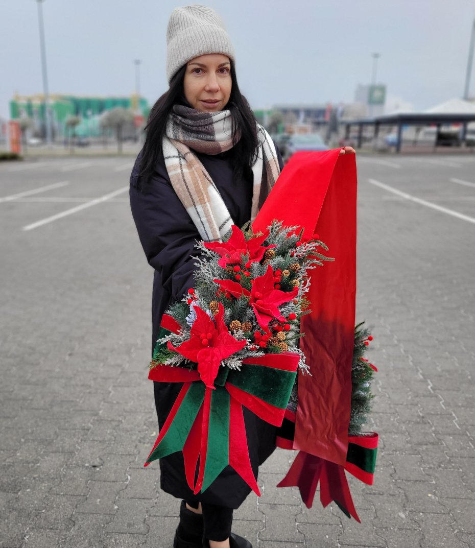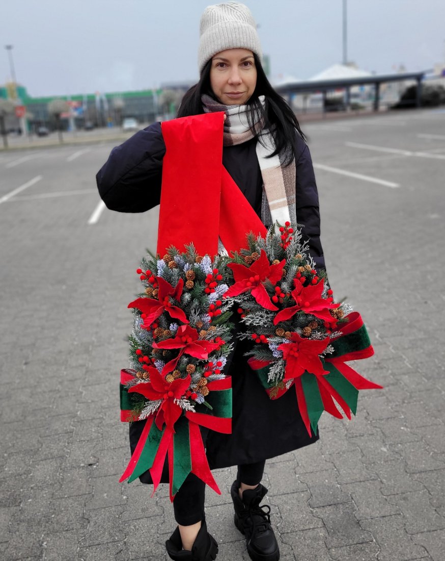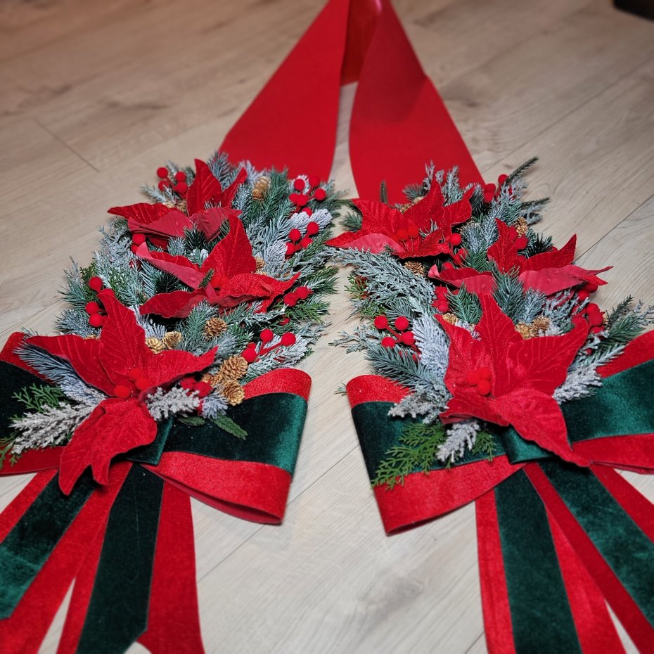 Stwórz prawdziwie świąteczną atmosferę przy wejściu do domu dzięki tej efektownej, dwustronnej dekoracji bożonarodzeniowej. Intensywnie czerwone kwiaty, iglaste gałązki z delikatnym efektem szronu, naturalne szyszki i dekoracyjne jagódki — wszystko to tworzy wyjątkowy, przyciągający wzrok akcent.