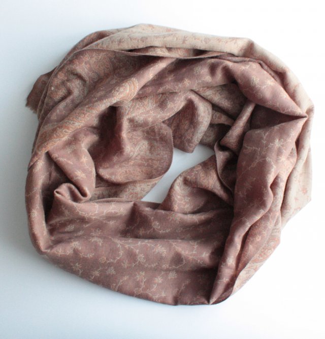 Ciepły, wzorzysty, dwustronny szal ( z jednej storny jasny, z drugiej-ciemny beż) w kwiatowe ornamenty.