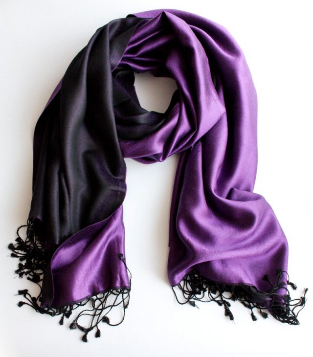 Miękki, elegancki, dwustronny szal. Z jednej strony czarny, z drugiej mocny fiolet. Szal można dowolnie układać uzyskując różne efekty kolorystyczne (szal może być cąły czarny, fioletowy lub mieszany jak na zdjęciach).