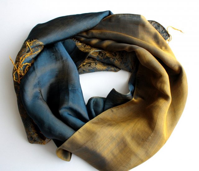 Piękny, dwustronny szal w wytłaczane wzory. Kolory dominujące to złocista oliwka i stonowany granat. Materiał to prawdopodobnie jedwab.