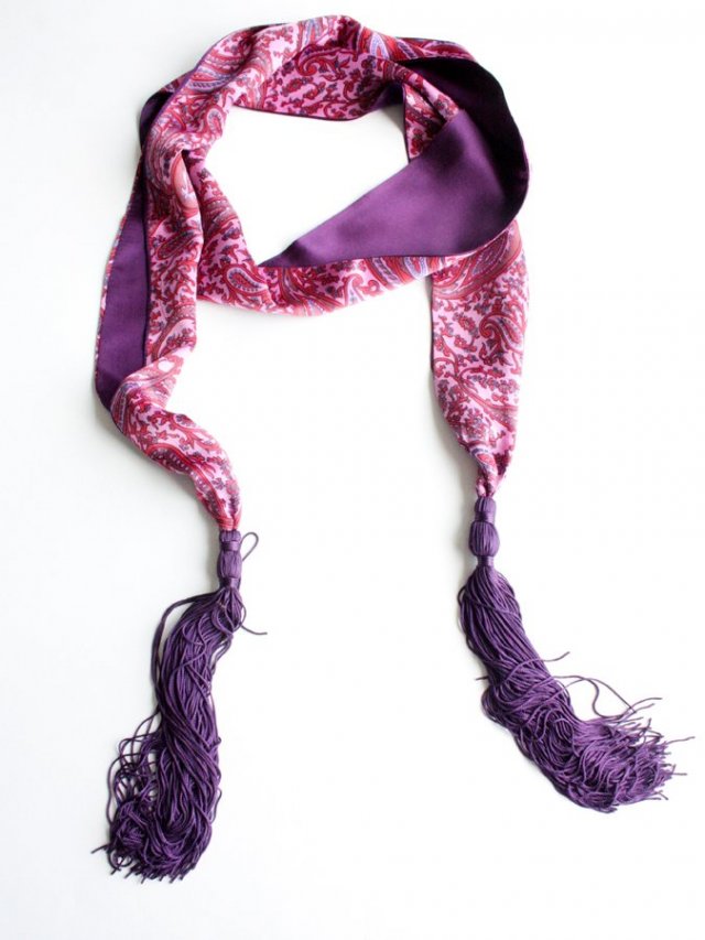 Dwustronny długi szal wykończony długimi chwostami. Materiał oceniam na jedwab.