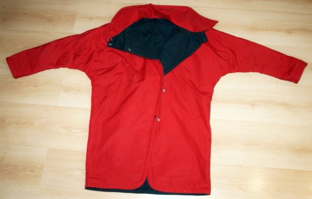 brak jakichkolwiek metek. płaszczyk uszyty w taki sposób, że można go moim zdaniem nosić na obie strony. jedna czerwona (kolor może sie trochę różnić) i ta ma kieszonki, druga czarna, bez kieszonek. rękaw jest wąski i dosyć krótki, więc albo na niższą osobę, bądz z zalożenia rękaw 7/8. płaszcz bardzo lekki. myślę, że powinien pasowac na 36. materiał prawdopodobnie bawełna (może z domieszką). jest warstwa ocieplająca.