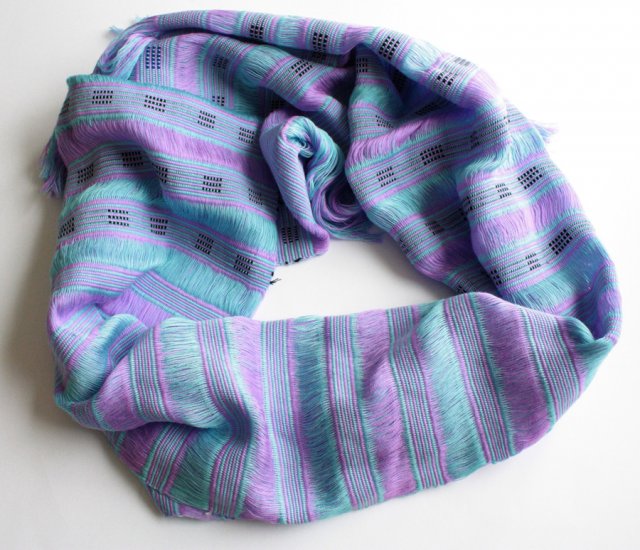 Dwustronny oryginalny szal w odcieniach błękitu i liliowego fioletu. Materiał oceniam na bawełnę lub wiskozę.