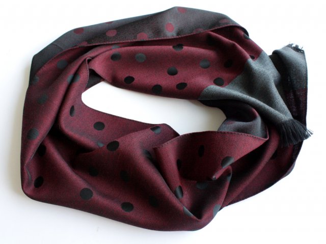 Elegancki dwustronny szal w grochy w odcieniach bordo i czerni. Materiał to prawdopodobnie wiskoza.