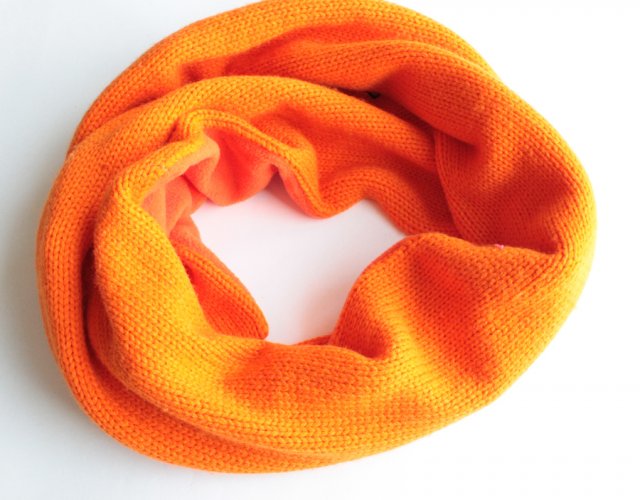 Ciepły, pomarańczowy szal marki H2O. Od wewnętrznej strony polar, na zewnątrz- dzianina. Kolor to głęboki pomarańcz, bez nuty żółtego, jak może wydawać się na niektórych monitorach.