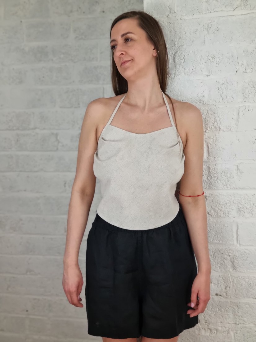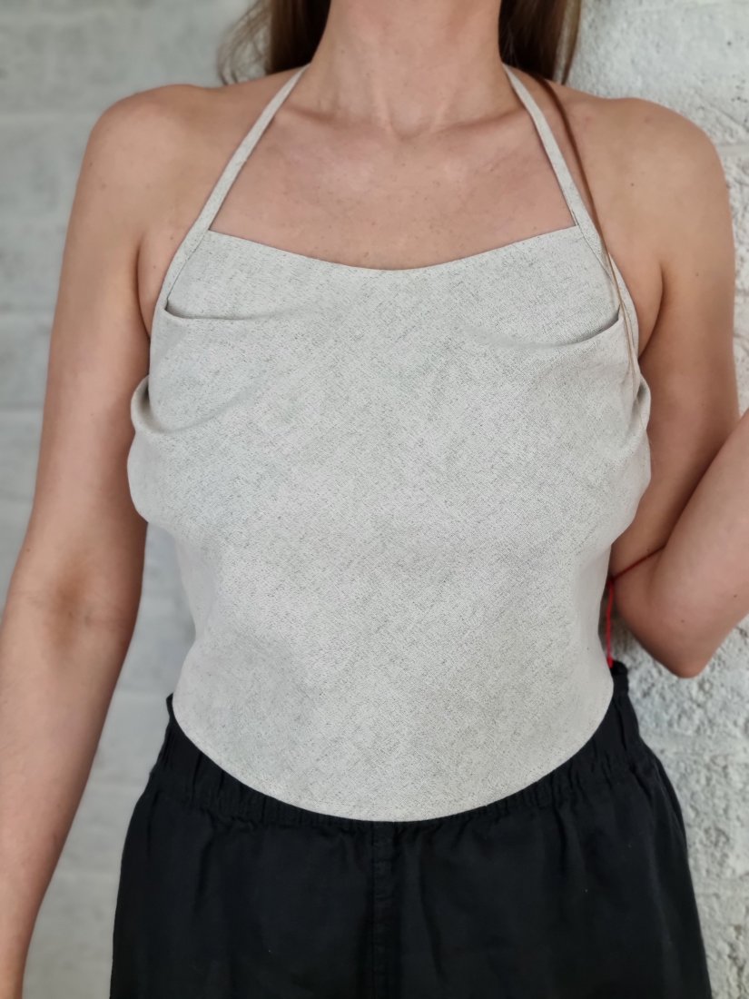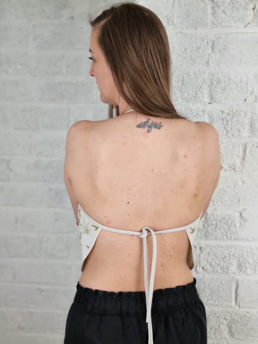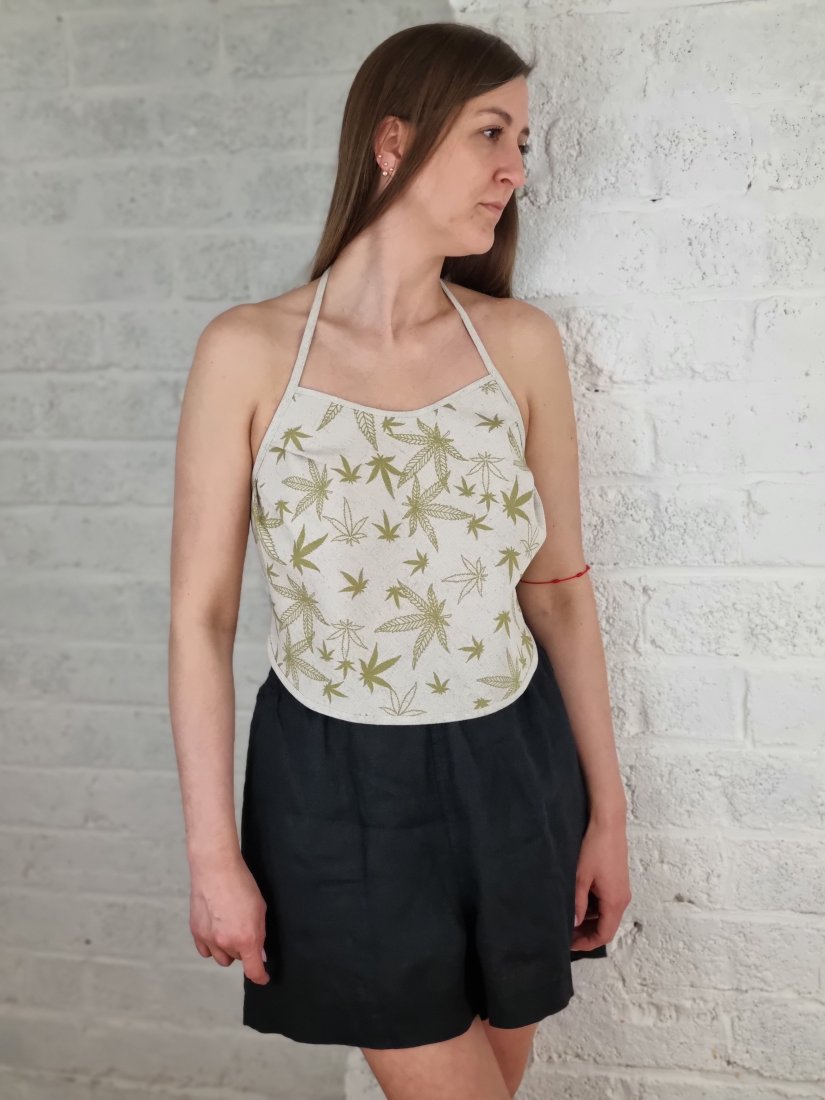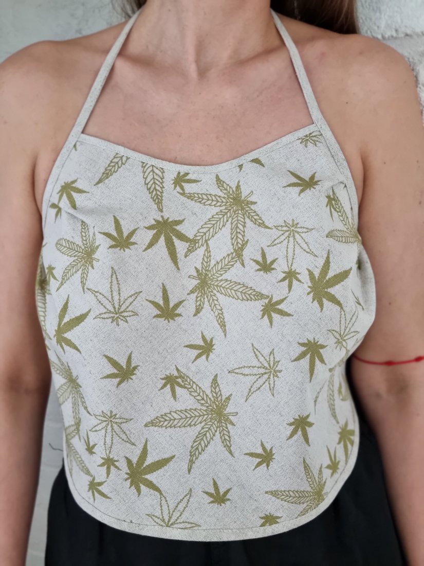 Topik, zawiązywany sznurkiem na plecach. Po jednej stronie nadrukowany wzor lisci konopii. Mozliwosc noszenia po obydwu stronach.