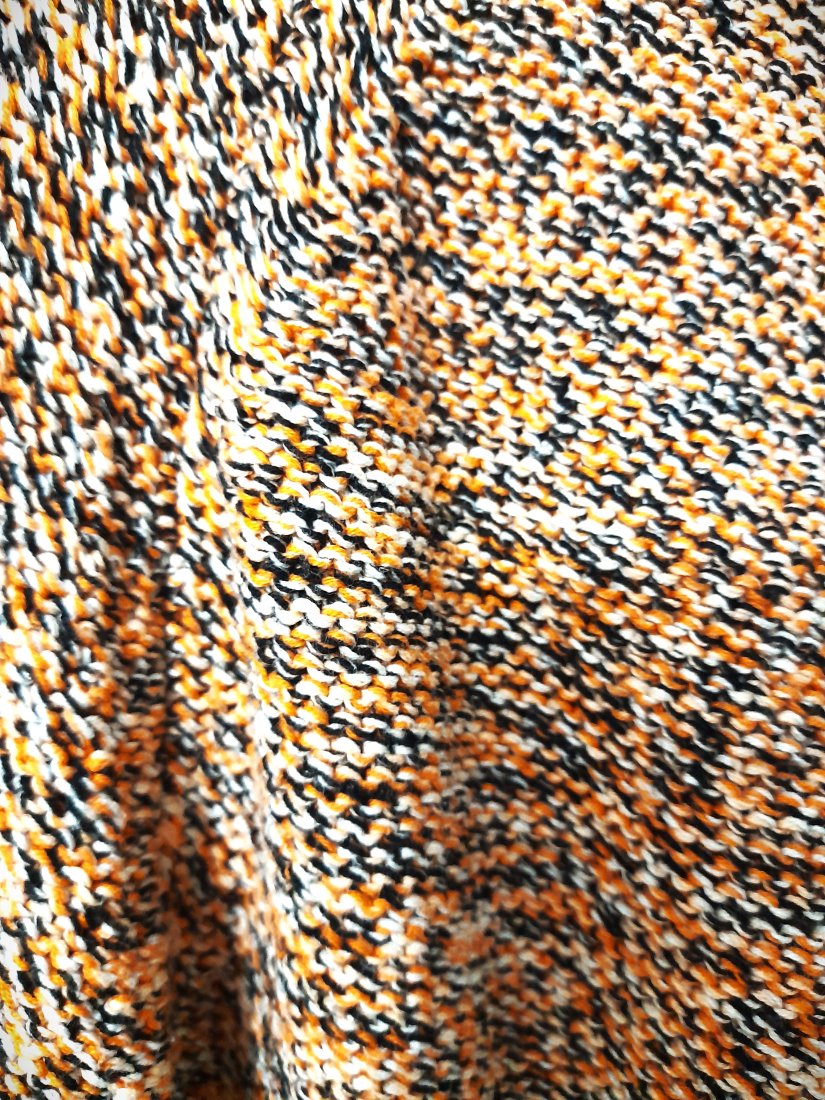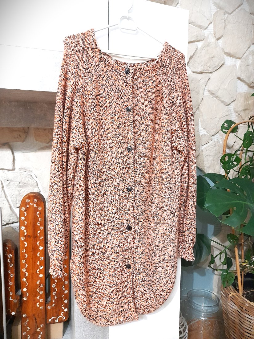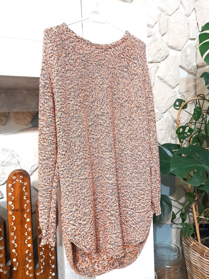 Uroczy sweterek w tonacji zgaszonej brzoskwini i brązu.