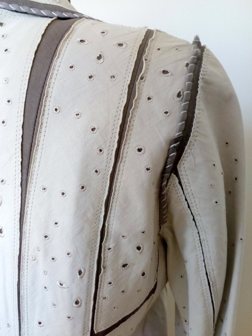 Ładny żakiet noszony na dwie strony, jedna strona z delikatnej jagnięcej skóry licowej w kolorze ciemnego kakao, druga z beżowej tkaniny z ażurowym haftem. Żakiet zapinany na trzy mocne zatrzaski, po obu stronach wpuszczane poziomo kieszenie, żakiet pochodzi ze sklepu monnari