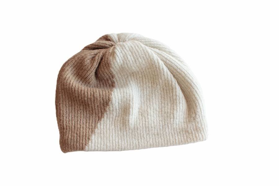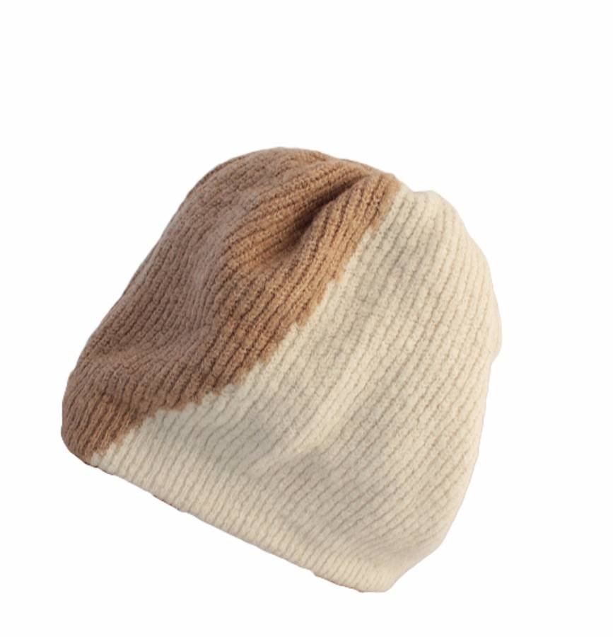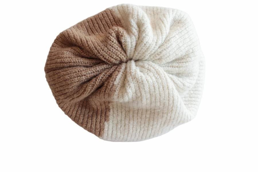Ciepła czapka vintage z dwóch warstw dzianiny w dwóch odcieniach beżu. Wierzch materiał typu akryl, od spodu dzianina bawełniana. Czapka jest przyjazna fryzurze, nie przylega ściśle do głowy.