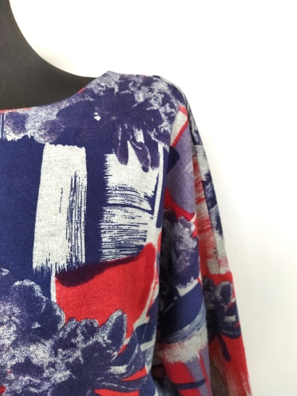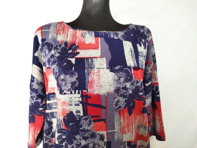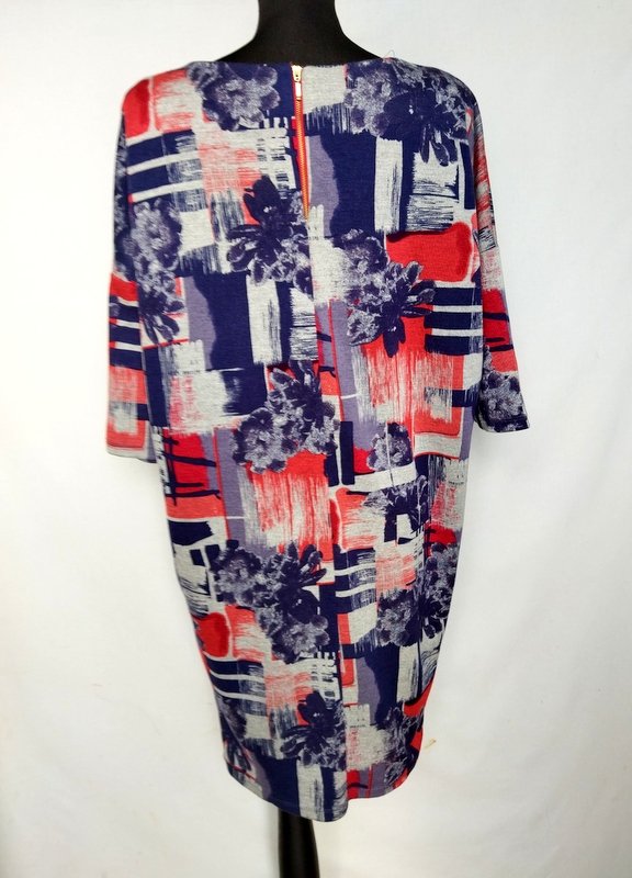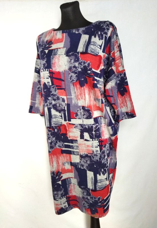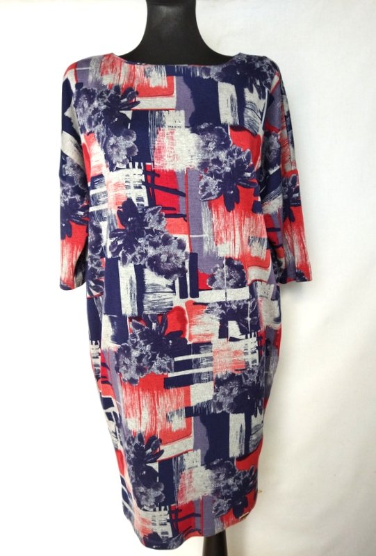 Sukienka z masywniejszej tkaniny dzianinowej w kolorystyce granatu, czerwieni i gołębiej szarości. Fason w kształcie litery V szerszy u góry z doszywanymi nisko rękawkami. Owalny dekolt. Zapinana na plecach na zamek.