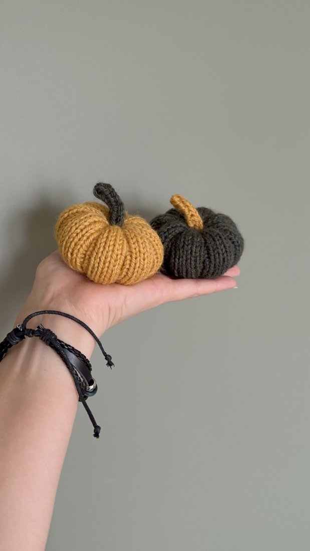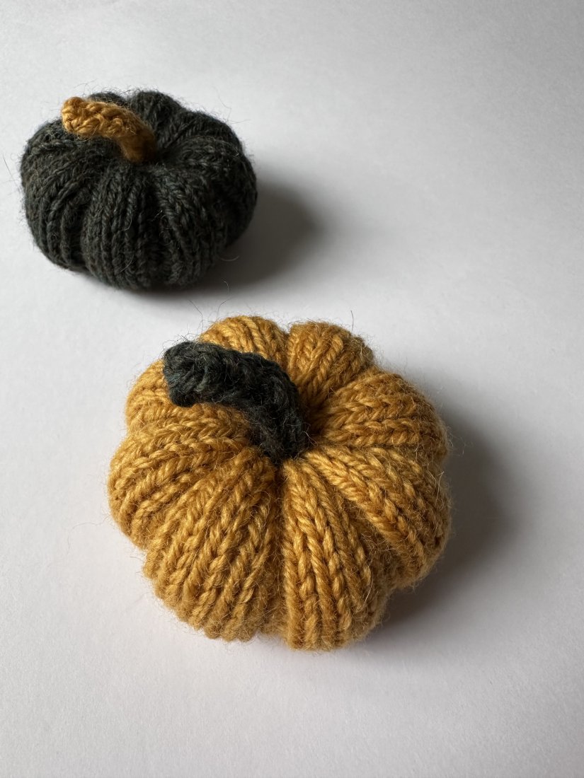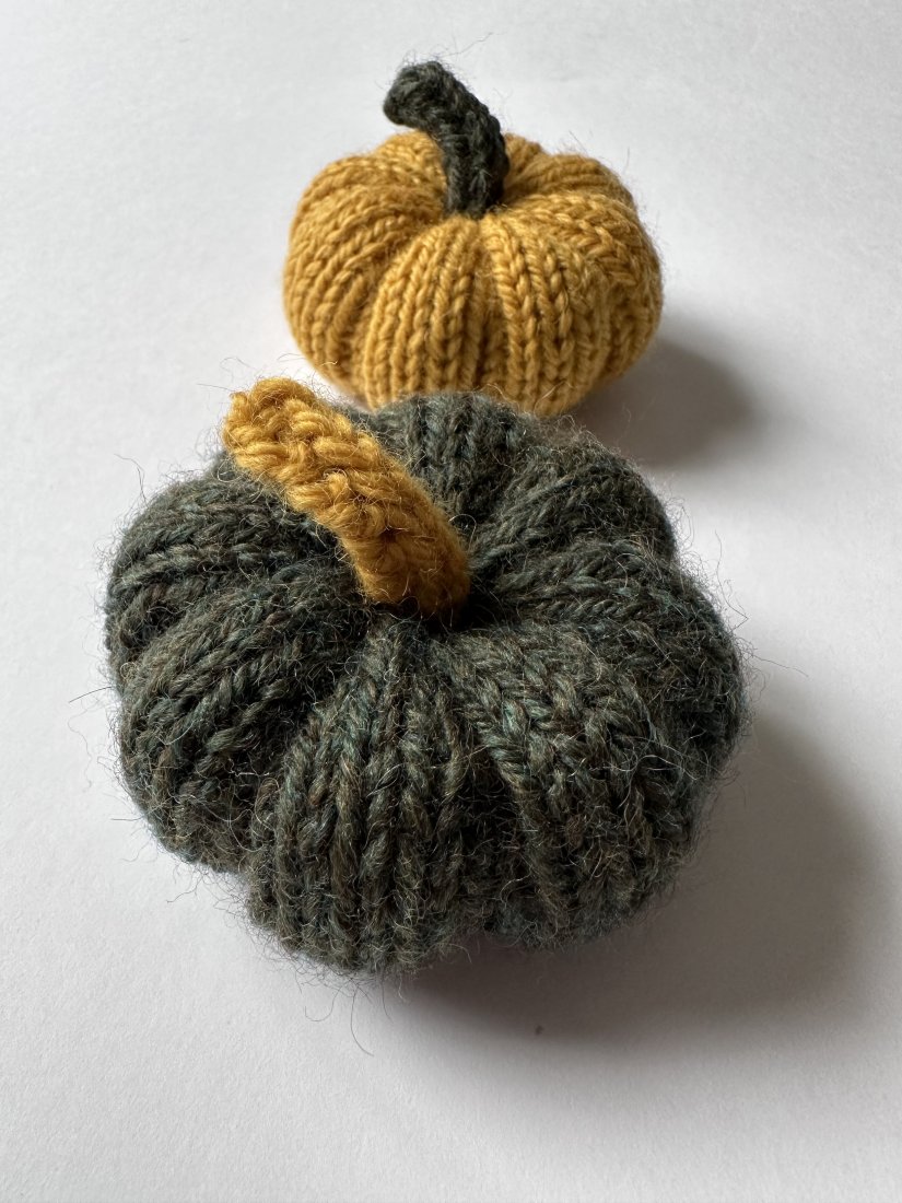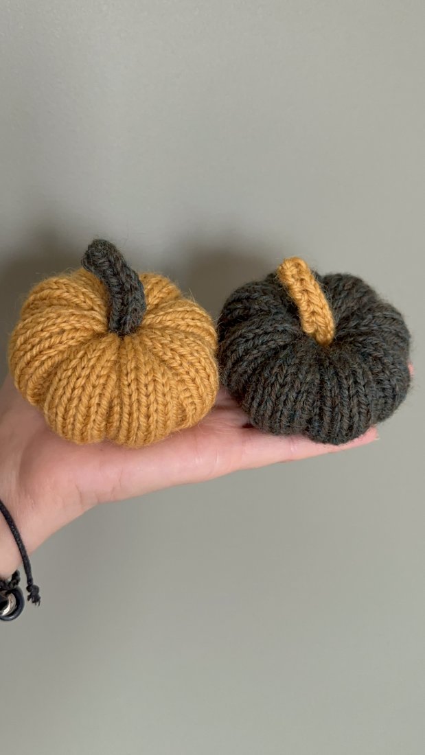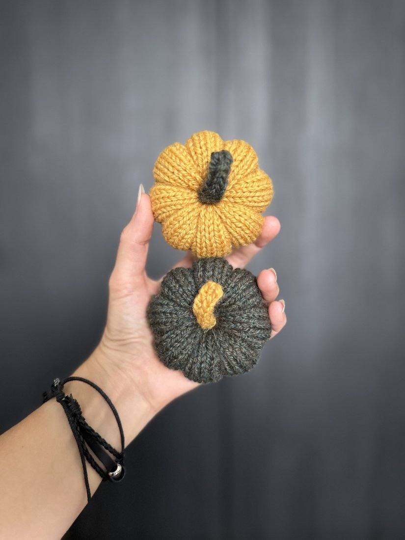 Komplet dwóch wełnianych dyń dekoracyjnych w rozmiarze S, wykonanych ręcznie na drutach z mieszanki wełny i alpaki.