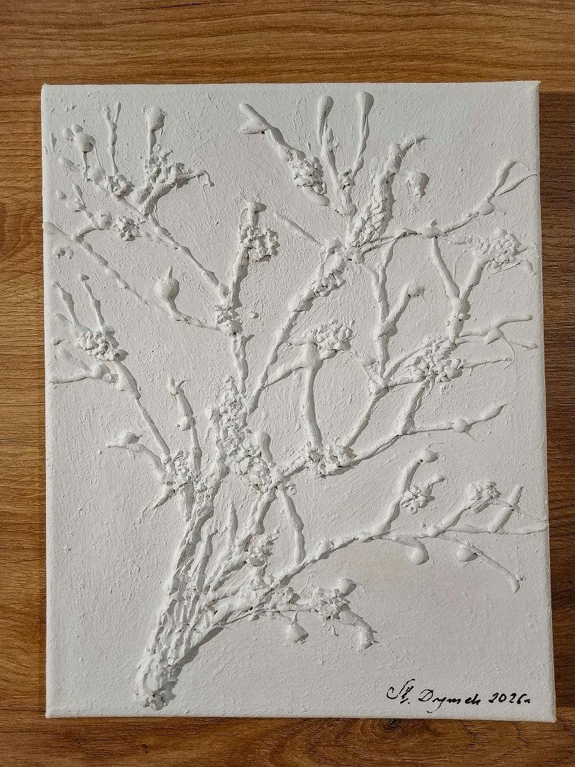 - Technika malarska mieszana: strukturalno-akrylowa - wyraźna faktura przy użyciu pasty strukturalnej tworzy efekt rzeźbiarski
