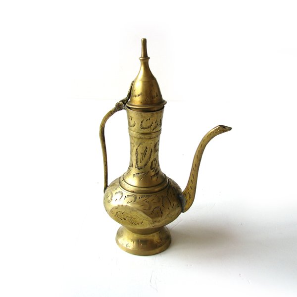 Piękny, smukły dzbanek wykonany z mosiądzu, zdobiony delikatnym grawerem na całej powierzchni. Ładny dodatek dla wnętrza, Polecam
