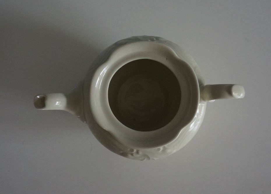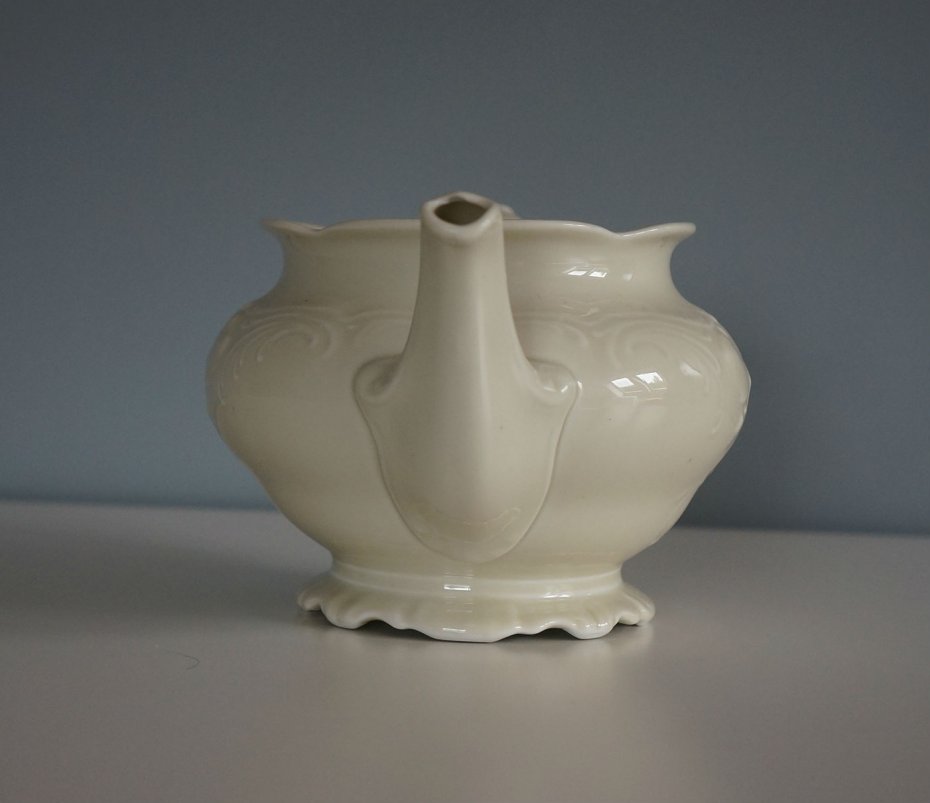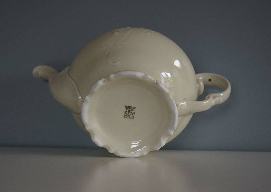 Mały dzbanek na herbatę (brak przykrywki) w kolorze ecru. Dzbanek sygnowany na spodzie KPM MADE IN POLAND (KPM to najpopularniejsza sygnatura śląskiej fabryki porcelany Krister Porzellan Manufaktur Waldenburg. Skrót KPM używały ponadto fabryki w Miśni oraz Berlinie). Produkt stary, oryginalny. Stan zachowania bardzo dobry.