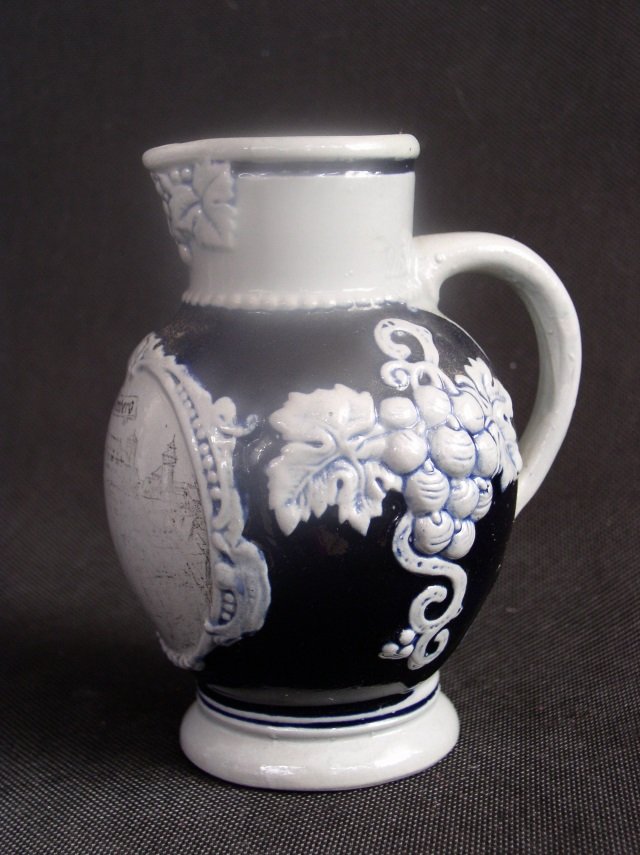 Dzbanek z dziubkiem na wino o pojemność 0,5 litra.Ucho do trzymania.Ozdobiony wypukłym wzorem-winogron z liśćmi.Z przodu był rysunek,niestety nie czytelny.Stan dobry.Wysokość 16 cm.Kolor szaro-granatowy.