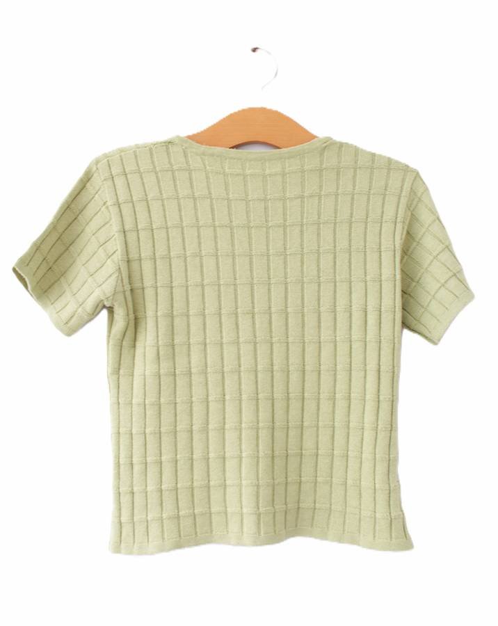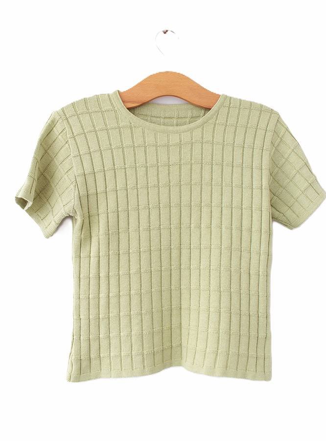 Bluzka dzianinowa vintage z krótkim rękawem, o krótkim kroju. Będzie idealny do spodni i spódnic zarówno w nowoczesnych, jak i nieco retro stylizacjach.