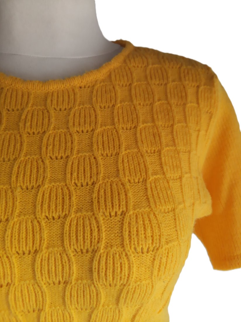 świetna dzianinowa mini sukienka vintage z lat 60-tych w pięknym słonecznym kolorze, krótki rękawek przed łokieć, góra z ozdobną fakturą, poniżej biustu sukienka ściągana sznureczkiem i wiązana w ozdobną kokardę, okrągły dekolt, bez podszewki, wkładana przez głowę, rozciągliwy materiał