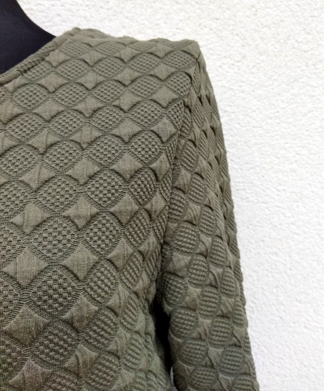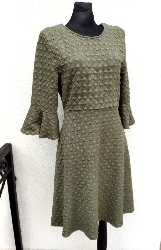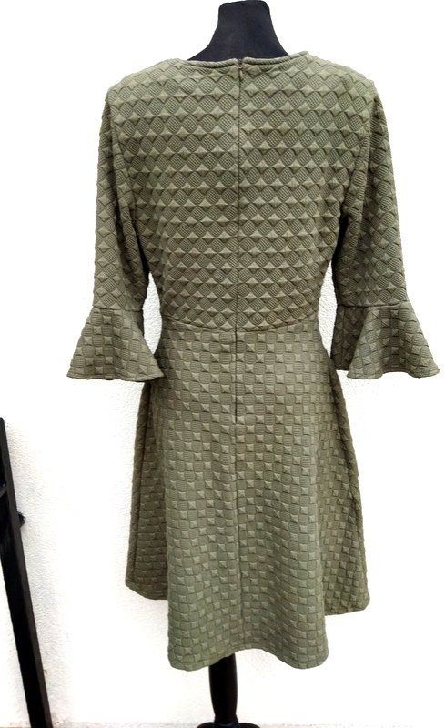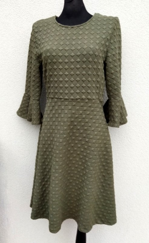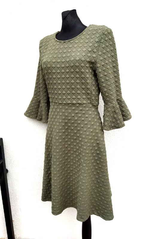 Sukienka z masywnej tkaniny dzianinowej w zielonym kolorze ( odcień zgniłej zieleni) z wypukłą przestrzenną fakturą. Odcinana w pasie góra dopasowana z owalnym dekoltem z rękawami z doszywaną falbaną z półkola, dół rozkloszowany . Zapinana z tyłu na długi zamek. bez podszewki. Podatna i lekko rozciągliwa