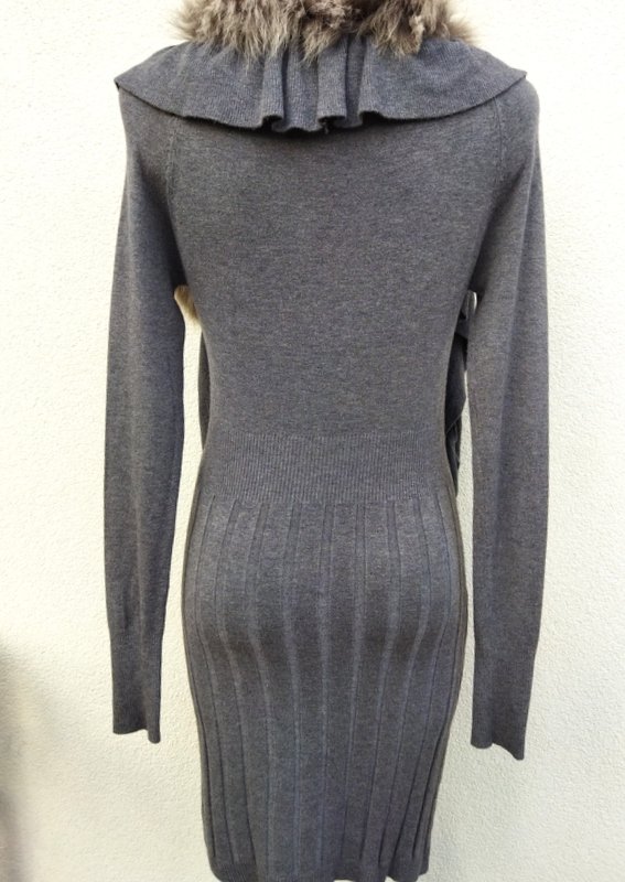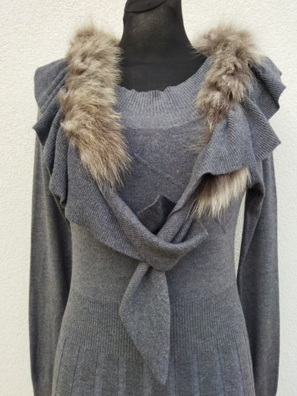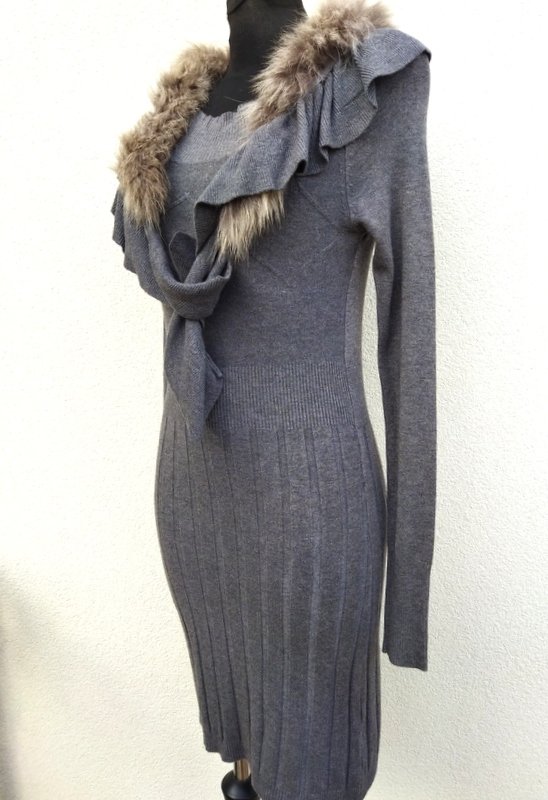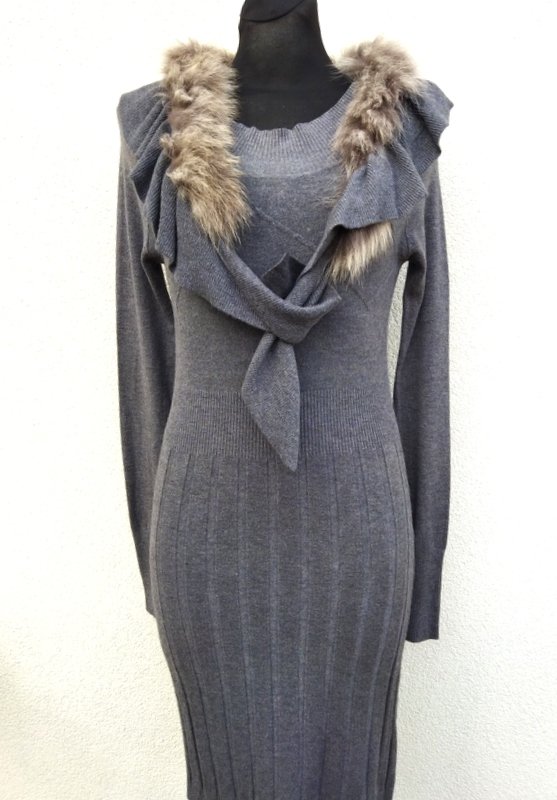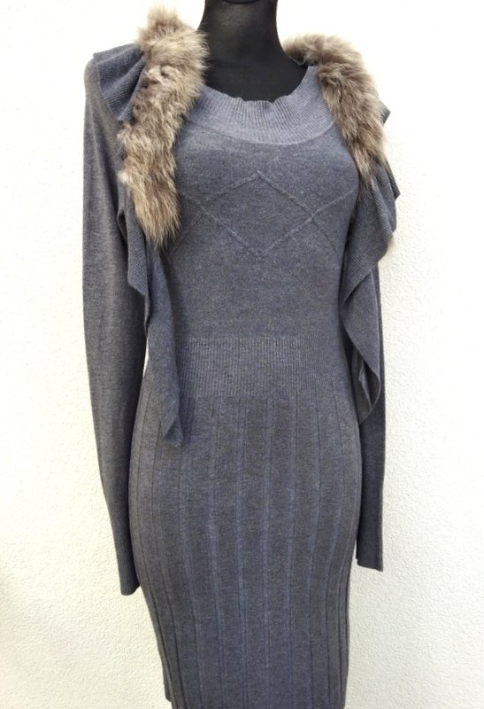 Sukienka z mocno rozciągliwej dzianiny wiskozowej w szarym kolorze z ozdobnymi ściegami. Ołówkowy fason z owalnym dekoltem z dopinanym falbankowym szalikiem obszytym futerkiem, z raglanowymi rękawami. Wykończona ściągaczami. Mila , podatna i rozciągliwa.