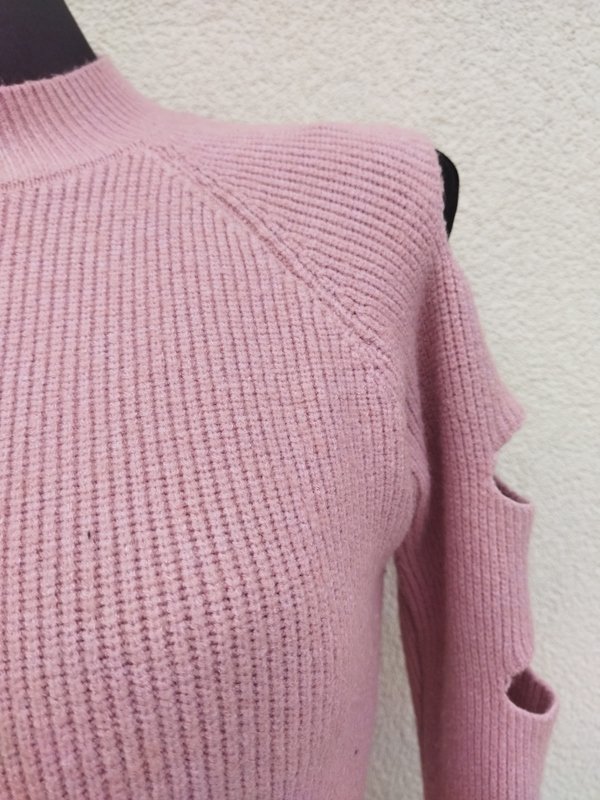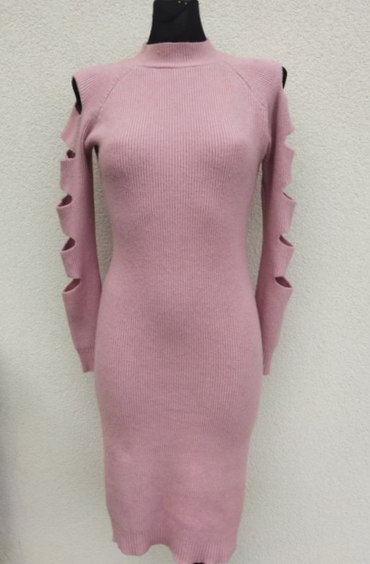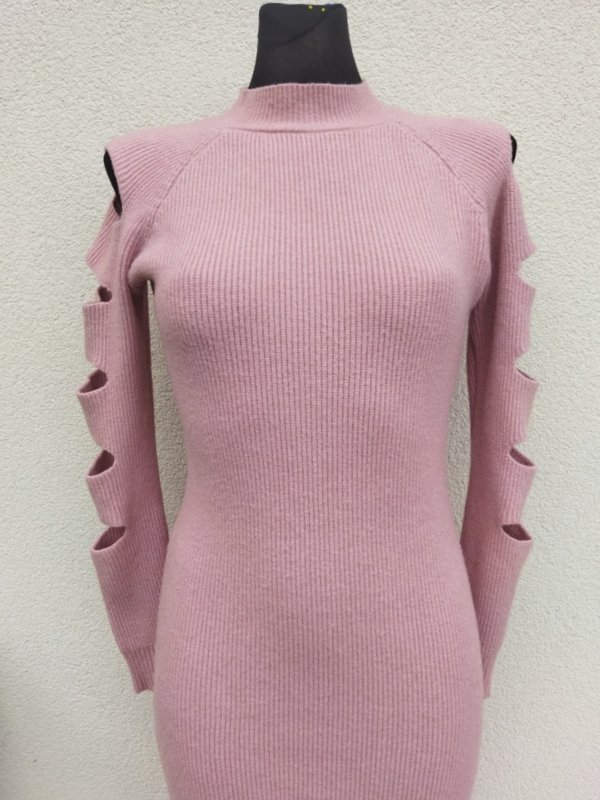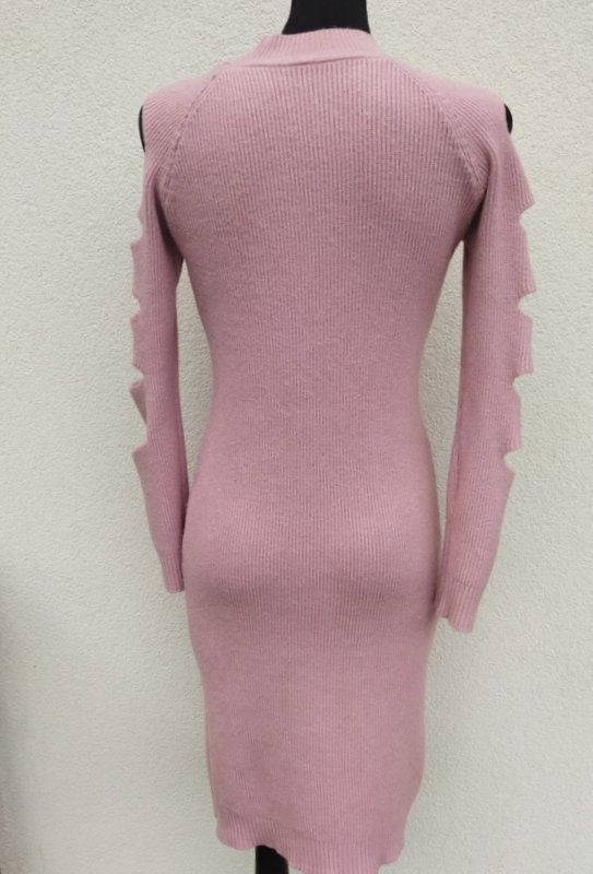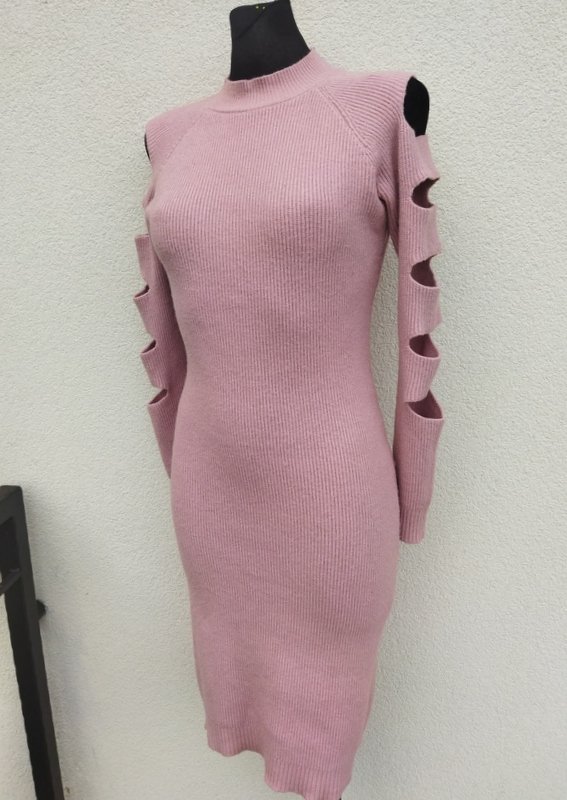 Rozciągliwa dzianinowa sukienka w kolorze zgaszonego różu z rozcinanymi rękawami. Taliowana idealnie dopasowująca się do figury.