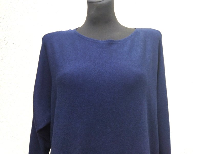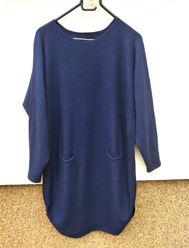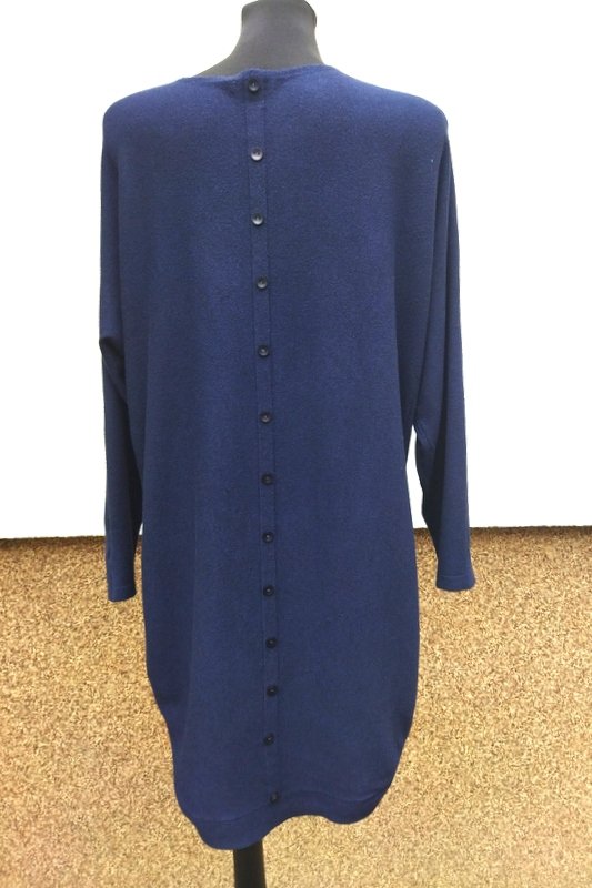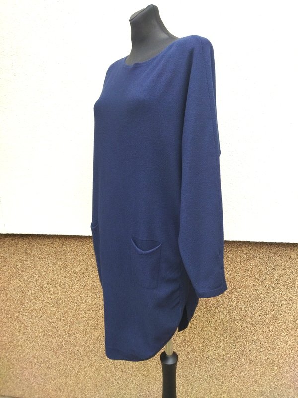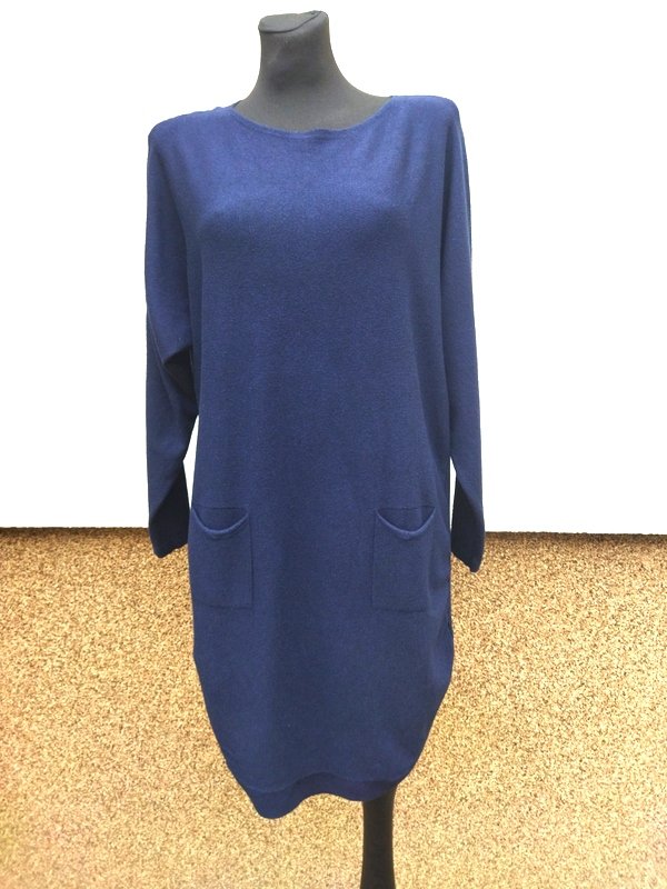 Dzianinowa sukienka w ciemnogranatowym kolorze. Minimalistyczny krój z owalnym dekoltem z rękawami krojonym z całości bez szwów przyramiennych, z dwiema naszywanymi kieszeniami, po bokach zaokrąglone rozcięcia, z tyłu naszywane małe guziczki imitujące zapięcie. Boki i dół wykończone prążkowanym ściegiem. Miła, podatna , rozciągliwa i bardzo praktyczna .