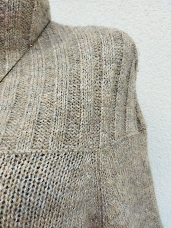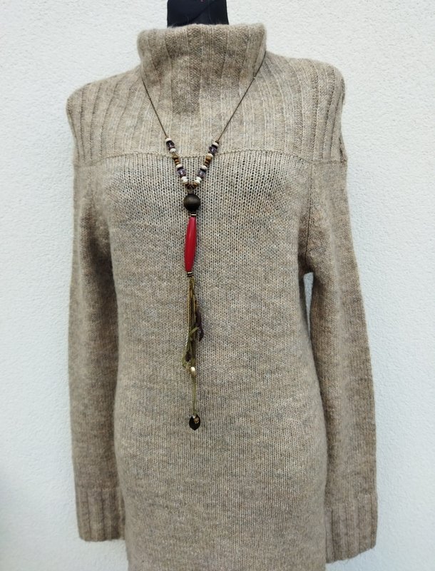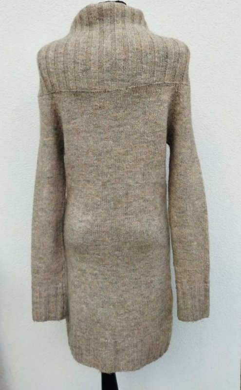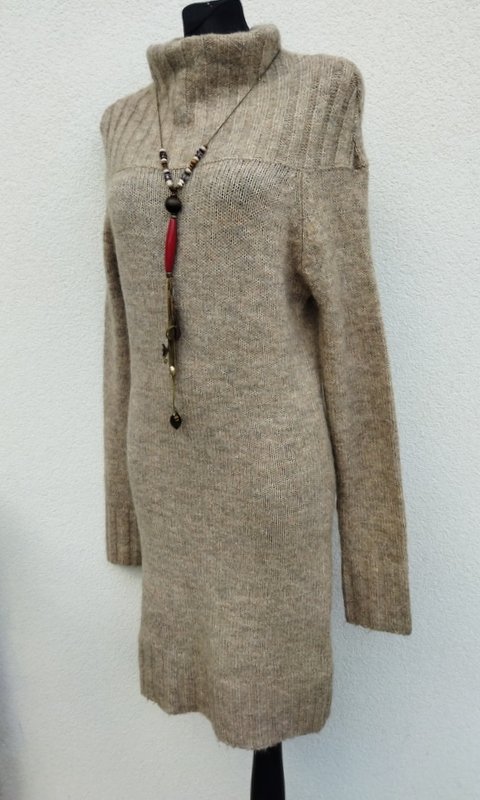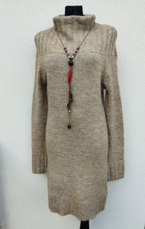 Dobrej jakości dzianinowa sukienka w melanżowym beżowym kolorze ( odcień kakao z mlekiem). Z ciekawym krojem u góry i wyprowadzonym golfem, z raglanowymi rękawami. Wykończona sciagaczami . Miła podatne i rozciagliwa