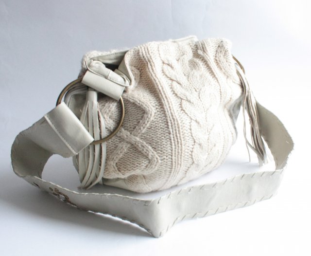 Jasnobeżowa torba wykonana z dzianiny i miękkich elementów ze skóry naturalnej lub ekologicznej. Torba posiada dwie boczne przegródki zapinane na pionowe suwaki wykończone ozdobnymi chwostami. Wewnątrz podszewka i dwie kieszonki. Cała torba zapinana jest u góry na zatrzask.