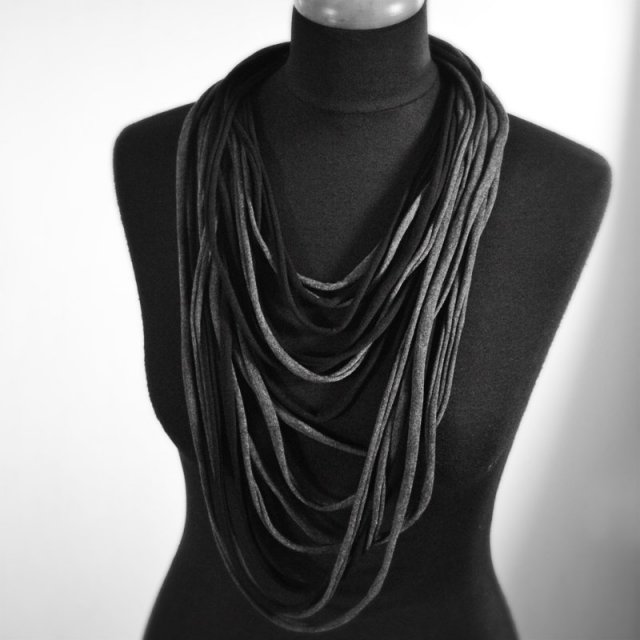 Naszyjnik wykonany został z czarnej i grafitowej dzianiny. Ręcznie cięty. Stanowi oryginalny i efektowny dodatek do stroju.
