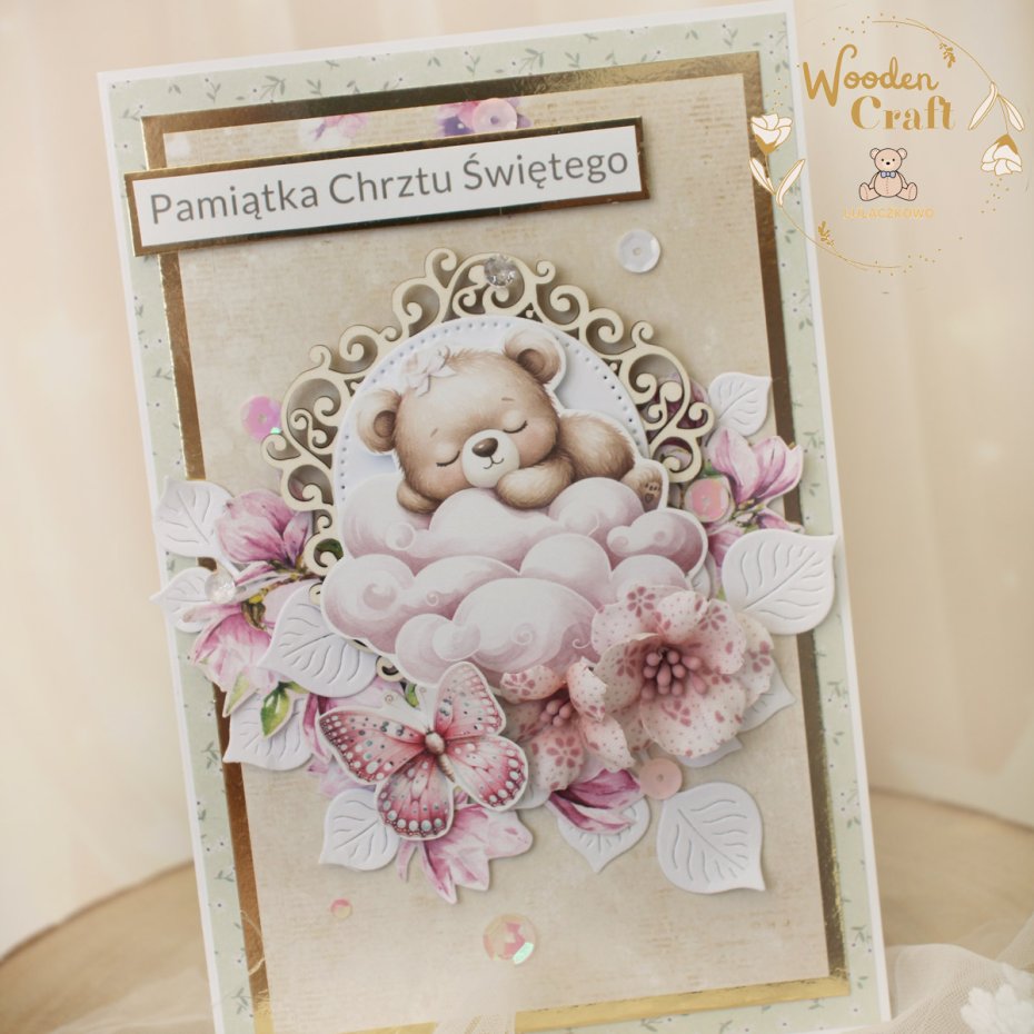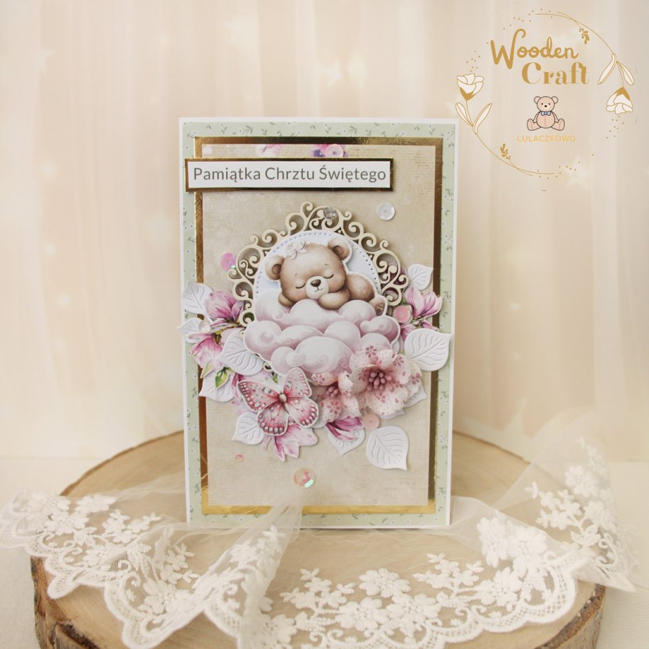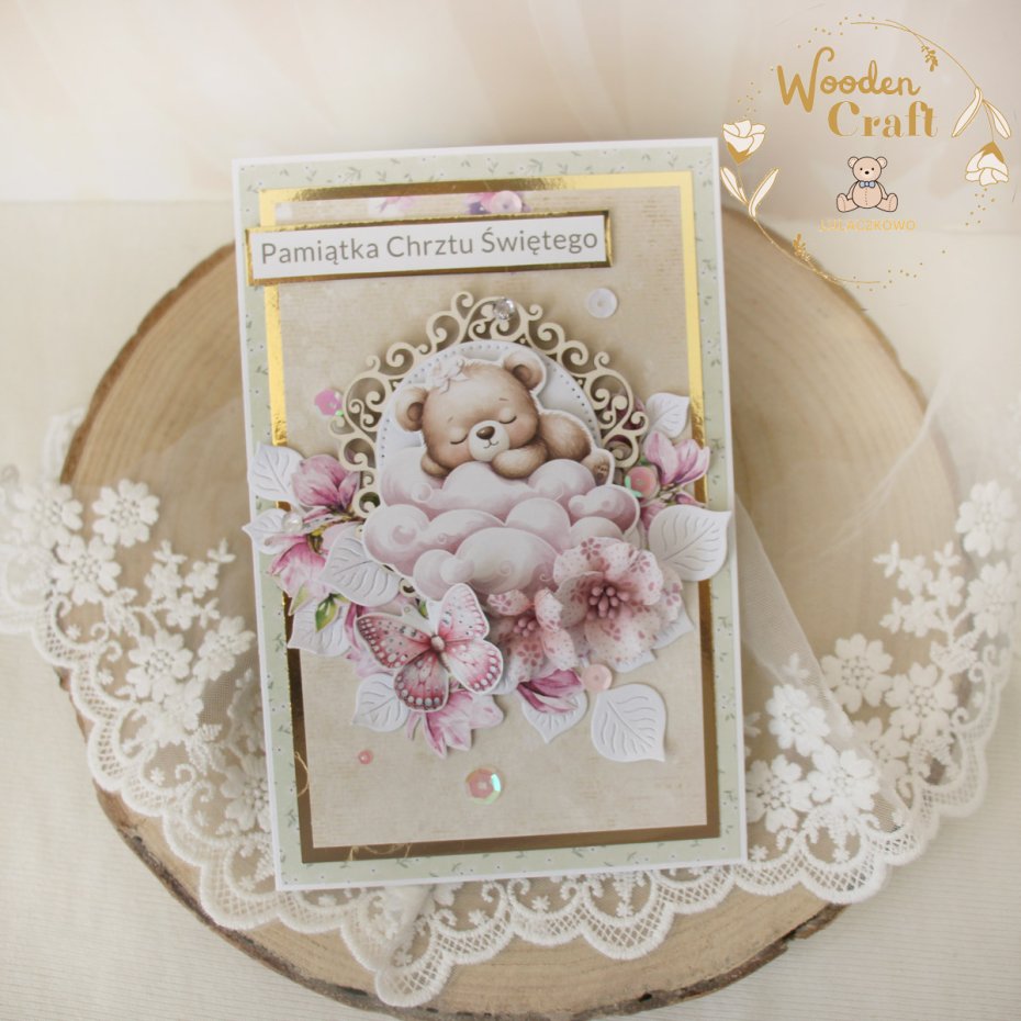Przepiękna i delikatna kartka na chrzest święty maluszka, utrzymana w odcieniach oliwkowej zieleni, beżu i różu z dodatkiem złotych błyszczących akcentów. Kartka wykonana ręcznie z dbałością o każdy szczegół, z mixu kolekcji papierów. Na froncie znajduje się grafika uroczego śpiącego na chmurce misia, ozdobiona tekturkową rameczką z zawijaskami oraz kompozycją kwiatową z materiałowych kwiatuszków, dodatkowo zdobiona cekinami, a także napisem "Pamiątka Chrztu Świętego" (na życzenie mogę wkleić na kartce również imię dziecka).