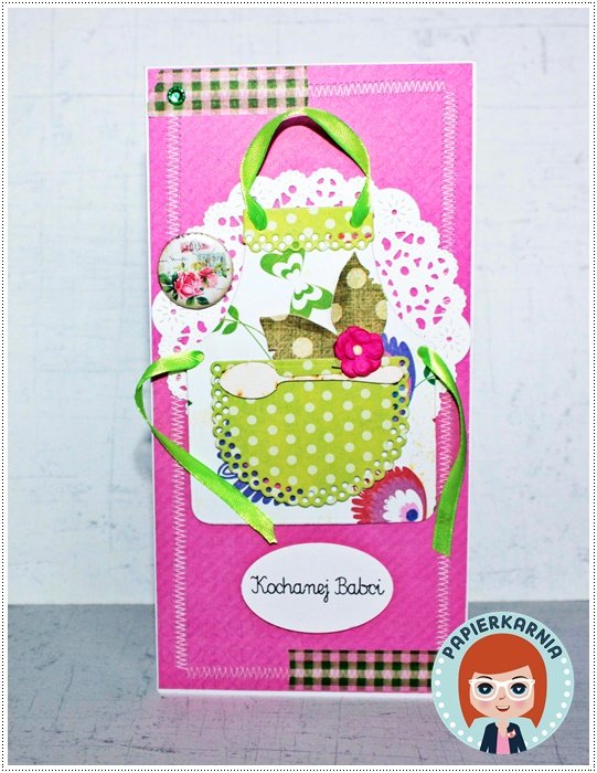 Bardzo radosna i kolorowa kartka dla babci z okazji jej święta. Główną ozdobą pracy jest fartuszek, który wszystkim wnukom kojarzy się z ciepłem i bezpieczeństwem oraz maszynowe przeszycia button, sztućce i kwiatek.