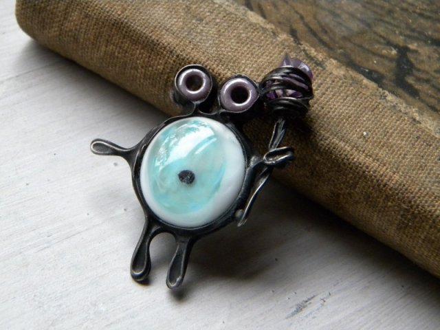 broszka.szkło i ametysty w ocynowanej miedzi stylizowanej na stare srebro.wymiary 5cm x 4,3cm.
