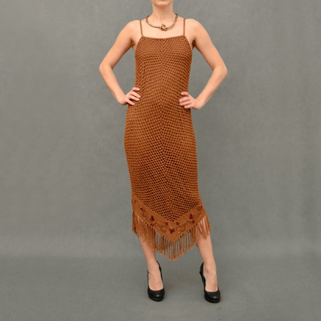 Dziergana sukienka od MANGO z dołem w szpic wykończona frędzelkami.