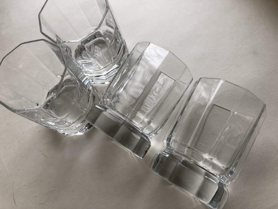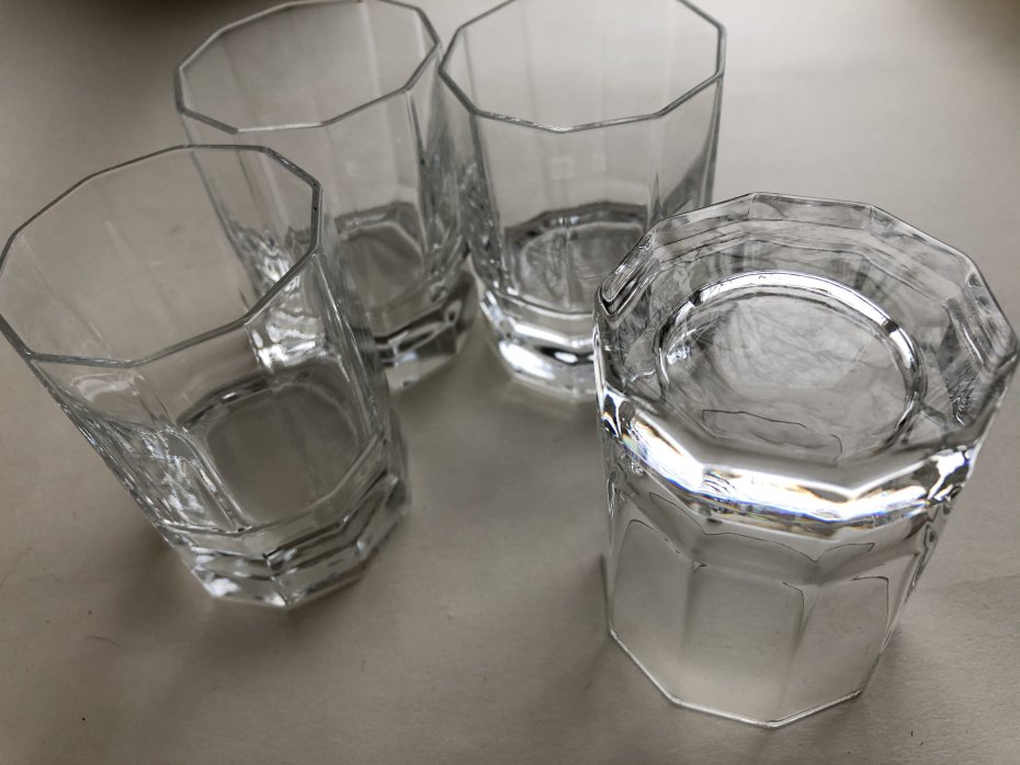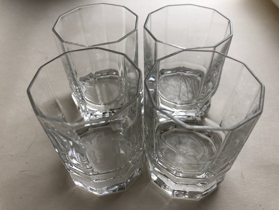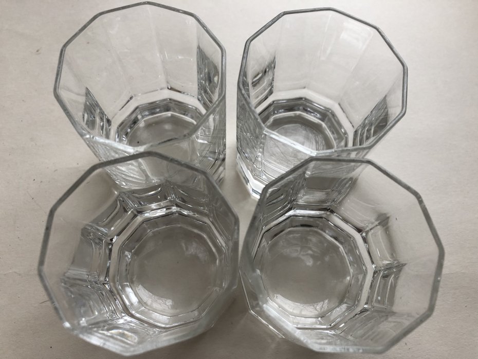 Niespotykane, bardzo efektowne duże kieliszki / mini szklanki. Cztery sztuki - angielski komplet. Dziesięciokątne, na szerszej podstawie. Arcyciekawe i poręczne . Podstawa 4,5 / 5 góra 5 cm wysokość 6,5 cm Stan zachowania bardzo dobry.